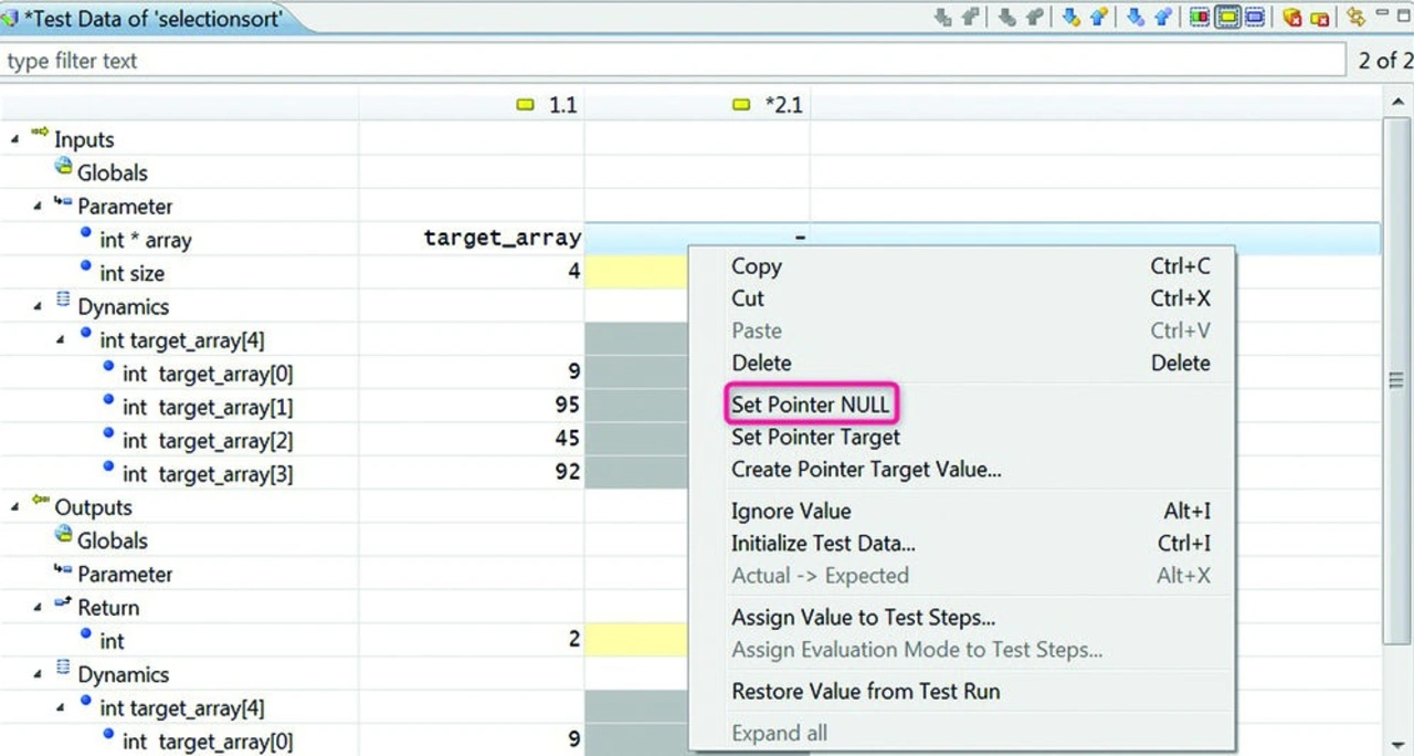 Beim Software-Unit-Test werden, anders als beim Fuzzing, gezielt Fehler injiziert. Ein Vorteil des Software-Unit-Tests ist es, dass es technisch sehr einfach ist, beliebige Eingabewerte – also insbesondere ungültige und abnormale – für den Test zu verwenden, wenn diese Eingabe per Parameter oder globale Variable erfolgt. Beispielsweise ist es technisch sehr einfach, für einen Pointer den Wert NULL oder für eine Variable einen ungültigen Wert zu übergeben (Bild 2). Technisch ebenso einfach ist es, einen ungültigen Wert als Eingabe zu verwenden, wenn es sich beispielsweise um den Rückgabewert einer durch das Testobjekt aufgerufenen Funktion handelt, und diese durch eine Platzhalterfunktion (Stub) ersetzt ist.