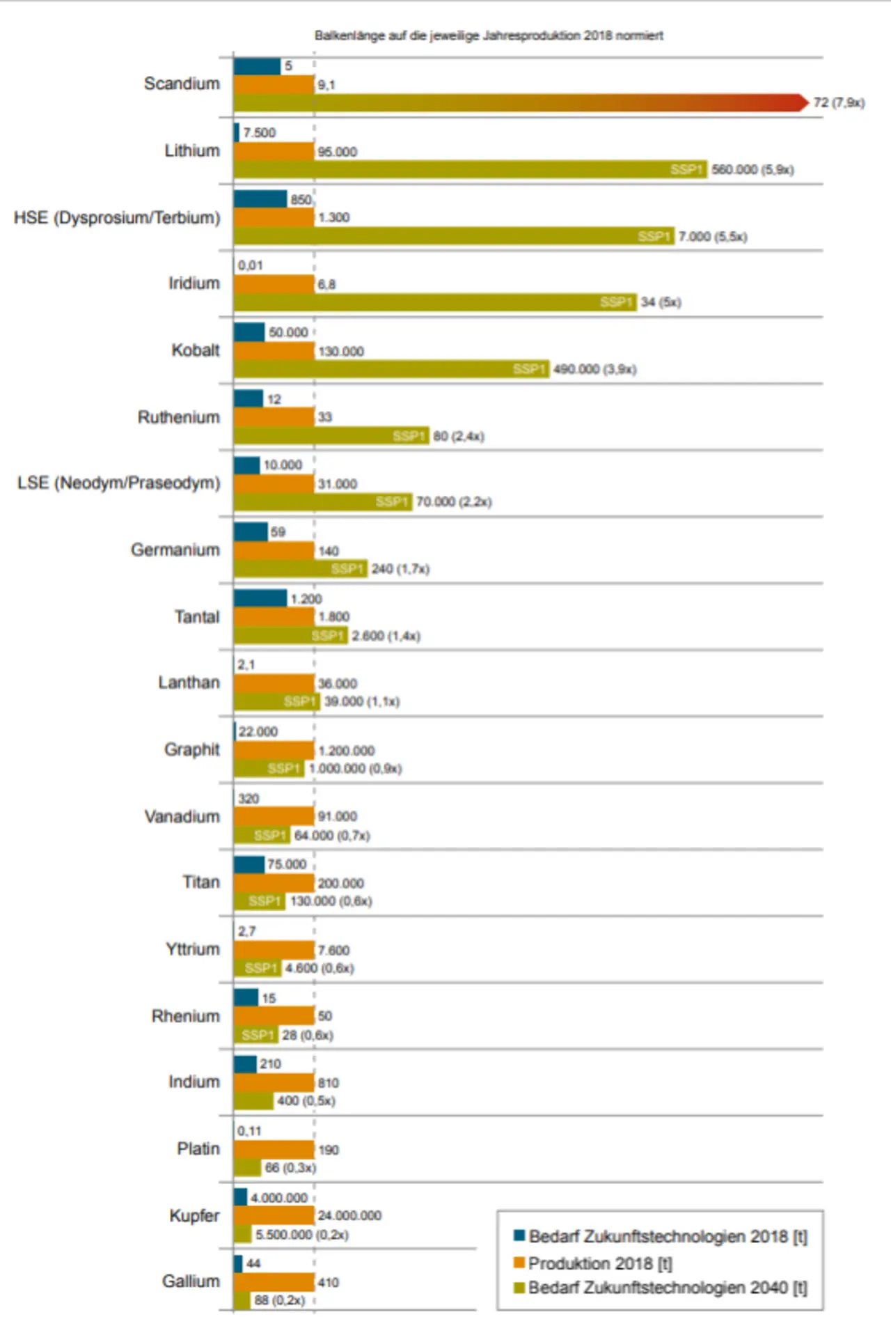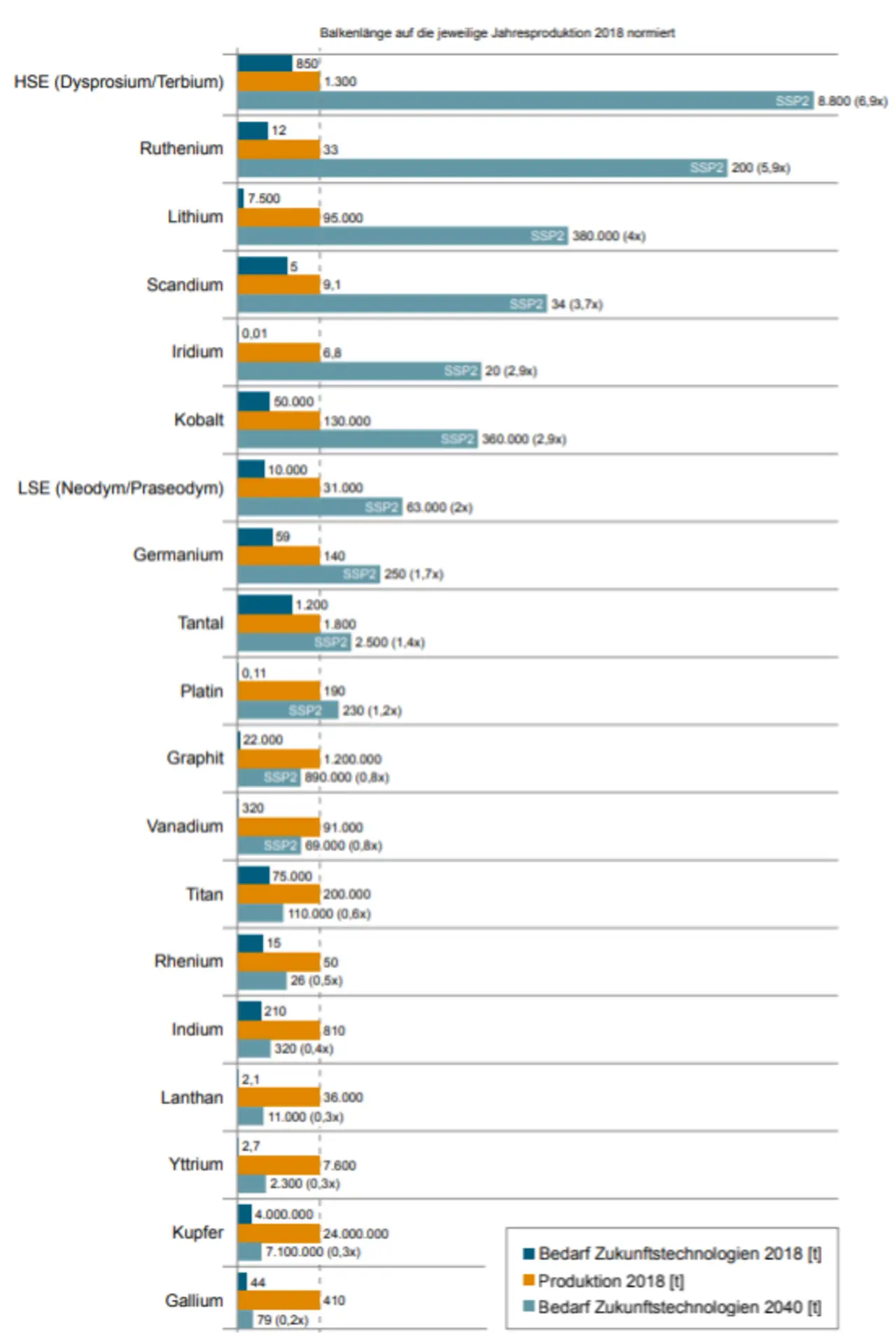 SSP2 bietet ein gemischtes Bild, vergleiche Abb. 5.2. Die Rohstoffbedarfe sind nicht so extrem wie in SSP1 und SSP5, erfordern zu ihrer Deckung bei sieben Metallen, nämlich bei den Leichten Seltenerdmetallen, Kobalt, Iridium, Scandium, Lithium, Ruthenium und den Schweren Seltenerdmetallen, allerdings immer noch eine Verdopplung bis etwa eine Versiebenfachung der jeweiligen Produktion aus dem Jahr 2018. Insgesamt wird durch die SSPs ein breites Bild einer zukünftigen Entwicklung aufgespannt, die jeweils unterschiedliche Schwerpunkte in der Technologieentwicklung setzt.