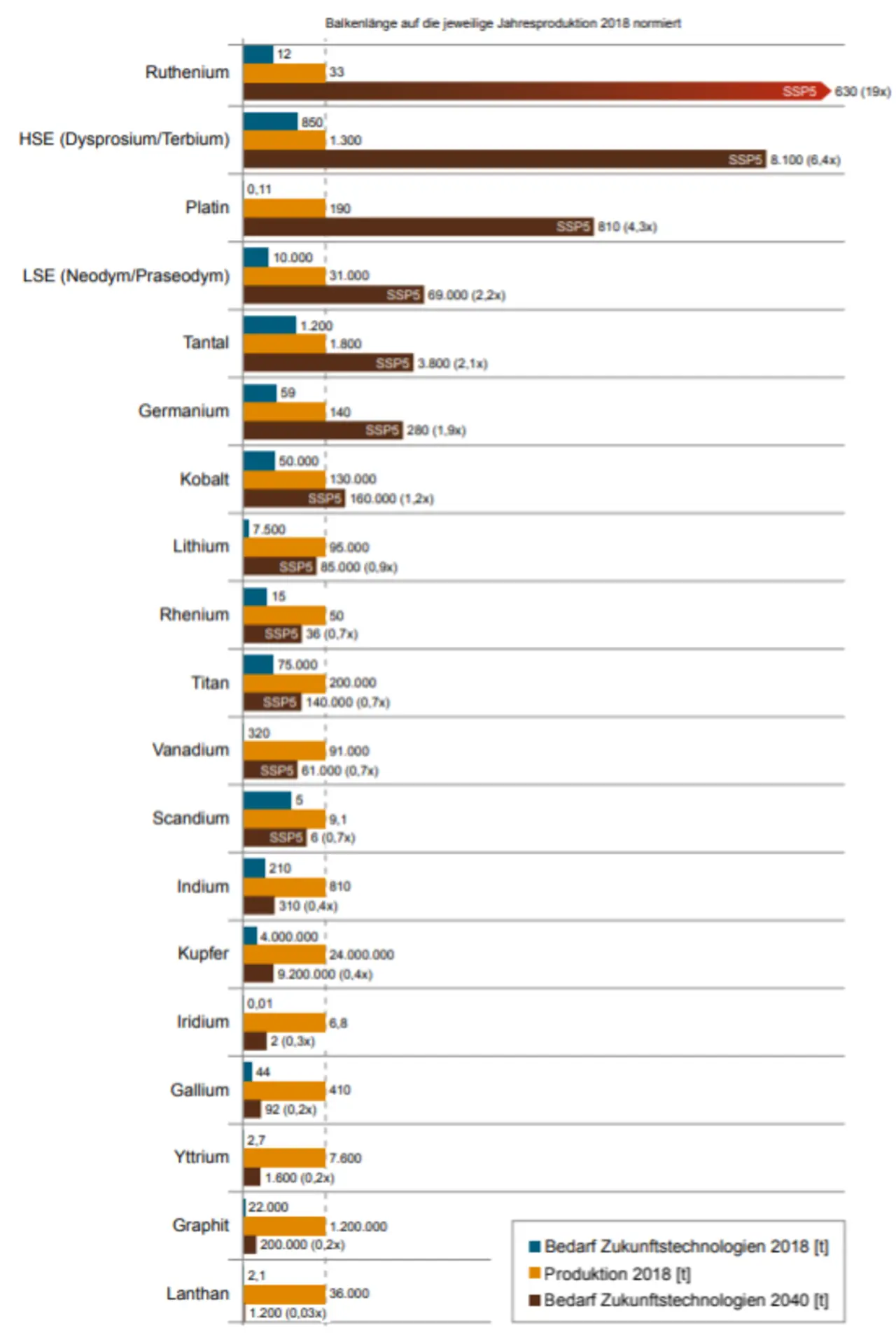 Im Bereich der Digitalisierung wird in SSP1 unterstellt, dass alle Menschen an dieser Entwicklung teilhaben sollen, so dass auch Ruthenium (HDDs) und Germanium (Glasfaserkabel) einen hohen Bedarf ausweisen. Im SSP5 fällt vor allem der hohe Bedarf an Ruthenium auf, der durch den hohen Speicherbedarf in den Rechenzentren hervorgerufen wird, siehe Abb. 5.3. Dieser ergibt sich aus einer im SSP5 unterstellten ungehemmten Nutzung der Digitalisierung durch Streaming-Dienste in hohen Auflösungen, zahlreichen Backup-Daten u. a. Die Bedarfe an Rohstoffen für die Elektromobilität und die Dekarbonisierung im Jahr 2040 sind deutlich geringer und liegen teilweise unter der Produktion von 2018.