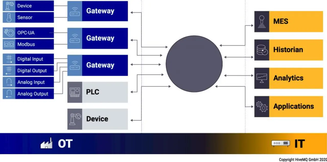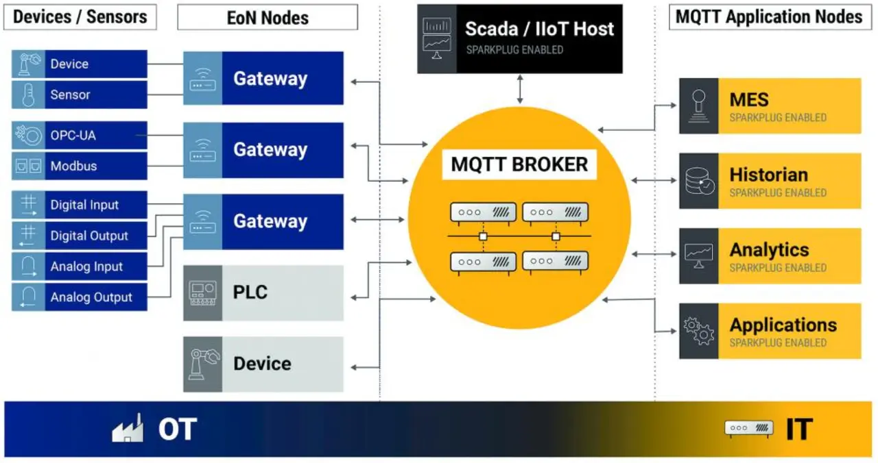 Inzwischen bieten Hersteller für ihre Geräte und Sensoren native MQTT-Schnittstellen an. Ist das Gerät bereits mit Sparkplug ausgestattet, kann es direkt an der Infrastruktur teilnehmen und identifiziert sich selbst als EoN-Knoten. Alle MQTT-Clients, insbesondere der SCADA-Host und die IT-Anwendungen, abonnieren die Themenbereiche, von welchen sie Informationen empfangen wollen. Mithilfe der Definition der Topic-Struktur und der Datenobjekte weiß jeder Client, wo und in welcher Form Informationen abzurufen sind. Die Clients sind zustandsbehaftet, sodass zu keiner Zeit ein Informationsverlust entsteht. Nachrichtentypen sind für bestimmte Informationen festgelegt.