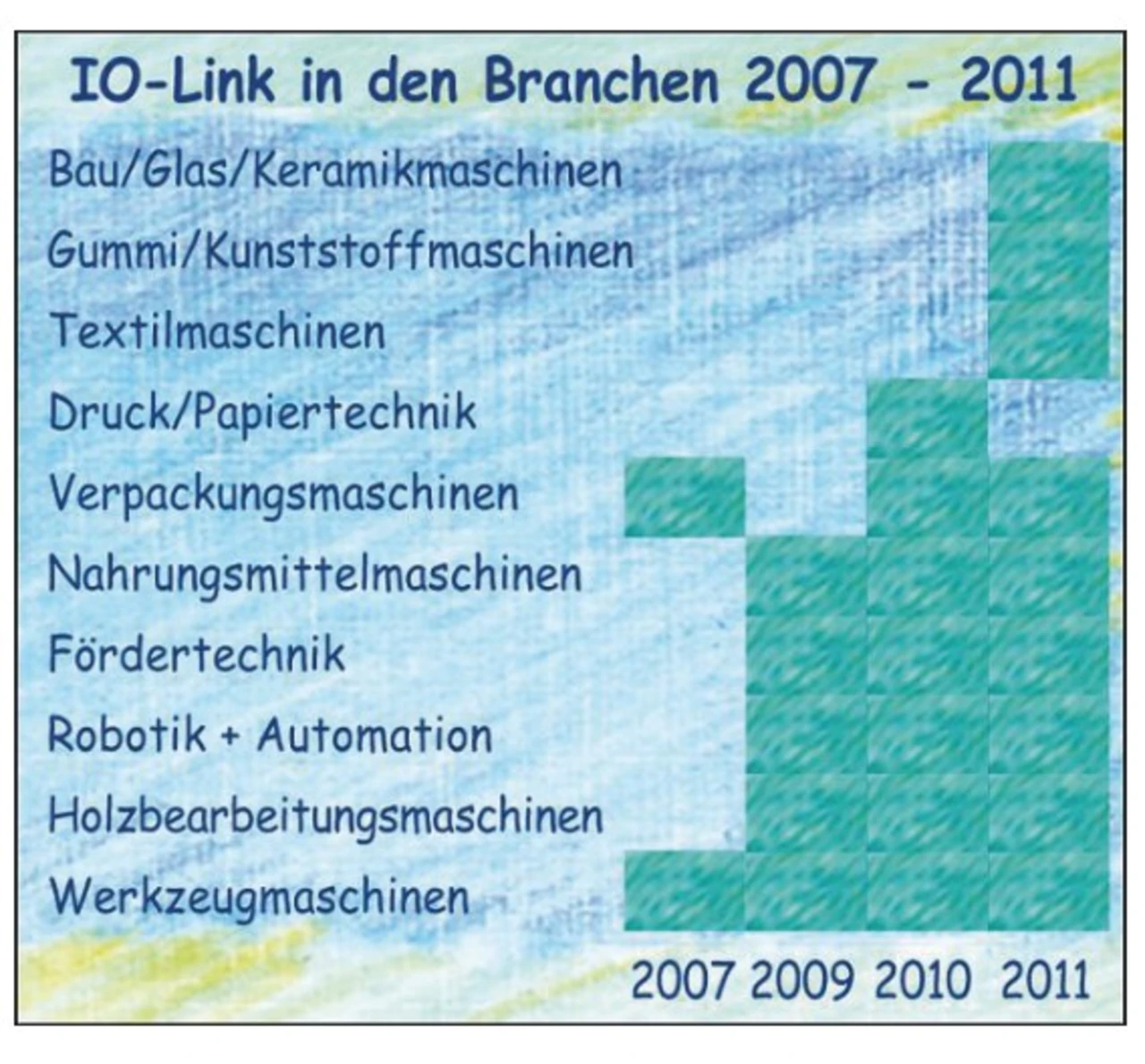 Die Marktuntersuchung der in Bochum und London ansässigen Quest TechnoMarketing e.K. untermauert diese Aussagen: »Seit 2007 wird IO-Link nach und nach in immer mehr Maschinenbau-Branchen genutzt«, sagt Thomas Quest, Geschäftsführer des Unternehmens. »Waren es 2007 noch zwei Branchen, in denen IO-Link zum Einsatz kam, nämlich Werkzeug- und Verpackungsmaschinen, sind es jetzt immerhin neun.« Generell zeige die Einführung von IO-Link »weder eine sprunghafte Aufwärtsentwicklung noch eine zähe Stagnation, sondern eine Entwicklung, wie sie für die prüfende Einführung einer neuen Technologie durchaus charakteristisch ist«, wie Quest betont. Seit drei Jahren in Folge steige der Anteil der Maschinenbauer, die IO-Link nutzen oder definitiv einführen wollen: »In diesem Jahr liegt er bei 12 Prozent der befragten knapp 250 deutschen Maschinenhersteller.«
