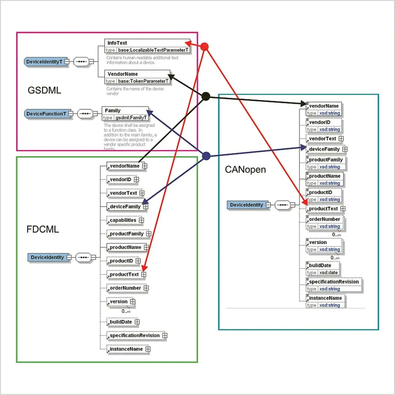 Der Geräte-Entwickler mag diese Aktivitäten und ihre bisherigen Ergebnisse mit Wohlwollen und Befremdung gleichermaßen sehen – sind doch die einzelnen Sprachen nach wie vor strukturell und semantisch unterschiedlich! Angesichts der hohen Entwicklungsaufwendungen für ASCII-basierte Lösungen und für Werkzeuge sowie unter Berücksichtigung der Migrationsthematik ist auch kaum zu erwarten, dass sich die XML-basierten Sprachen der verschiedenen Systeme plötzlich vereinheitlichen lassen. Nichtsdestotrotz gilt das Gerätemodell nach ISO 15745 bei der Definition XML-basierter Gerätebeschreibungssprachen als Konsens beziehungsweise als grundlegender Rahmen. So sind zum Beispiel die GSDML, die XML-basierte CANopen- Beschreibung und FDCML auf dieser allgemeinen Ebene semantisch gleich – die konkrete Ausprägung in XML ist jedoch unterschiedlich.