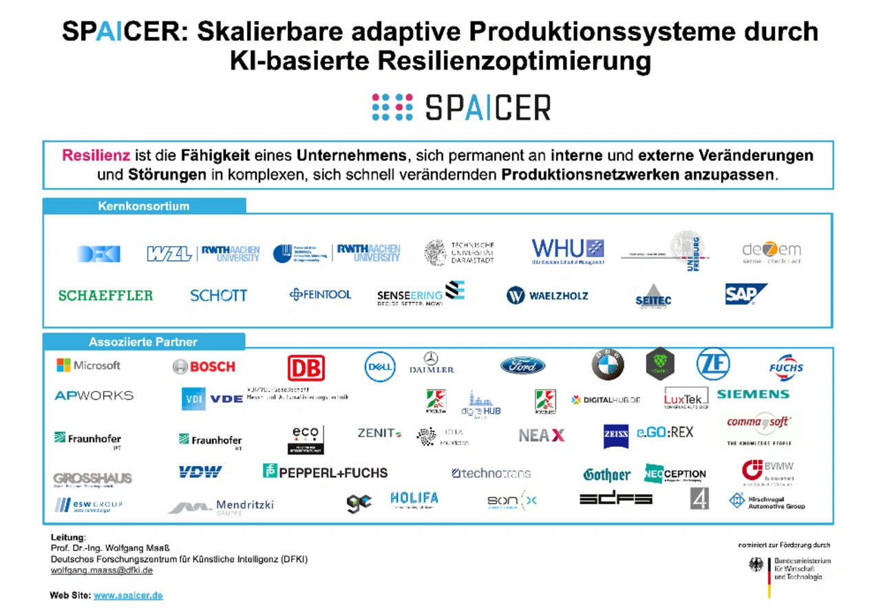 Die RWTH Aachen (Rheinisch-westfälische Technische Hochschule) und das DFKI (Deutsches Forschungszentrum für Künstliche Intelligenz in Saarbrücken haben sich beim KI-Innovationswettbewerb des Bundesministeriums für Wirtschaft und Energie (BMWi) mit dem Projekt SPAICER »Skalierbare Adaptive Produktionssysteme durch KI-basierte Resilienz-Optimierung« durchgesetzt und wurden für eine Förderung ab 2020 nominiert.