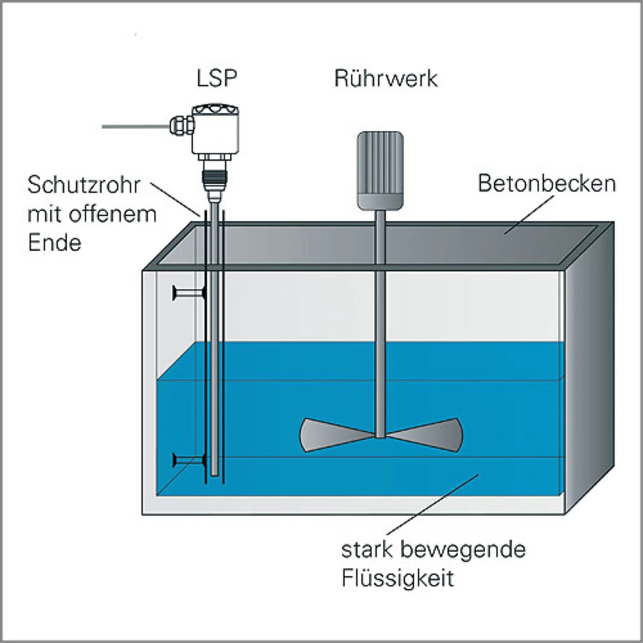Auch das Messen in Behältern mit bewegter Flüssigkeit ist eine besondere Herausforderung an die Füllstanderfassung. Um den Füllstand einer sich stark bewegenden Flüssigkeit in einem Becken aus Beton hochgenau zu erfassen, wurde der Messstab mittig in ein Edelstahlrohr mit einem Innendurchmesser von 30 mm eingebracht. Die vorgenommene Funktionsprüfung ergab ein einwandfreies Mess-Ergebnis. im
