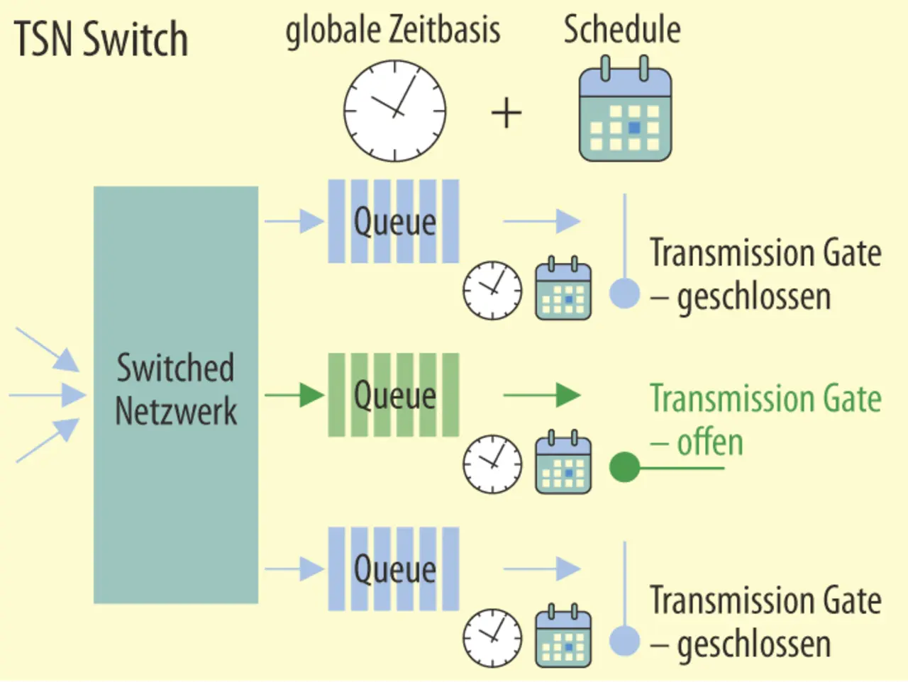 Das zentrale Prinzip hinter TSN ist ein Konzept namens Time Aware Shaper (TAS, Bild). Switches, die nach diesem Prinzip arbeiten, teilen den Datenverkehr gemäß ihrer Priorität in verschiedene Warteschlangen (Queues) ein, die anhand eines globalen Zeitplans (global schedule) abgearbeitet werden.