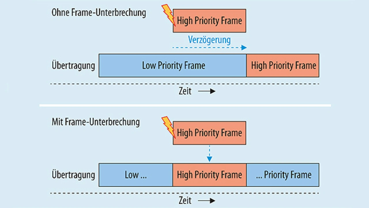 Gleichzeitig war eine Videokamera an das Netzwerk angebunden, die Störsignale, also einen Videodatenstrom, über das Netz sandte. Mit konventionellem Ethernet (CSMA/CD) war auf der rotierenden Scheibe praktisch kein Schriftzug zu erkennen, mithin eine Echtzeitfähigkeit nicht gegeben. Mit dem Audio-/Video-Broadcast-Protokoll, aus dem TSN weiterentwickelt wurde, war immerhin ein zitternder Schriftzug sichtbar, d.h. die Verbindung war von einem Jitter geprägt, der sich innerhalb einer gewissen Toleranz bewegte. Mit TSN Frame Preemption war der Schriftzug absolut stabil und damit die Synchronisation zwischen Positionssensor und Stroboskop perfekt. Der Trick: Während beim AVB-Protokoll die besonders langen Video-Frames erst zu Ende übertragen werden, bis ein zeitkritischer Steuer-Frame folgen kann, wird bei der Frame Preemption der Video-Frame unterbrochen und der hoch priorisierte Steuer-Frame unmittelbar übertragen (Bild 2). Für die Effizienz der Netzwerk-Übertragung ist noch wichtig, dass der Video-Frame genau an der Stelle fortgesetzt wird, an der er unterbrochen wurde, d.h. er muss nicht komplett neu gesendet werden.