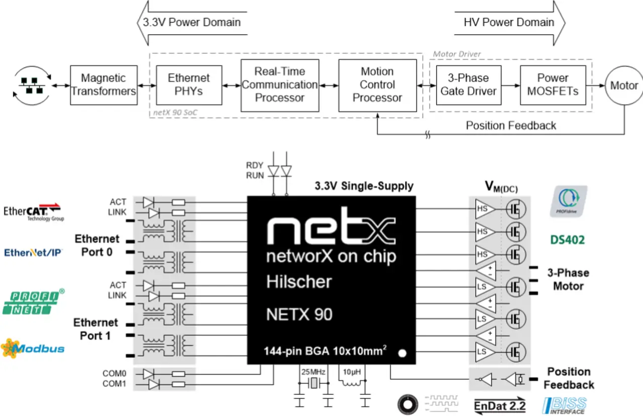 Wir haben im Zuge der netX-90-Entwicklung unser Chip-Development-Team in Richtung Analogentwicklung erheblich erweitert. Das Team ist inzwischen mehr als doppelt so groß wie vorher, und wir haben auch Expertise hinzubekommen, die sich mit Motor-Control-Basisfunktionen sehr gut auskennt. Dies eröffnete uns die Chance, in der Spezifikationsphase des netX 90 mit den Antriebskunden, die wir ja schon kannten, in Workshops genau festzulegen, welche Merkmale und Funktionen in Hardware vorhanden sein müssen. Darauf basierend haben wir die Hochleistungs-A/D-Wandler sowie die PWM-Timer-Funktionen für die vorgesehenen Motion-Control-Anwendungsfälle entwickelt. Diese IPs sind alle in-house bei Hilscher entstanden.