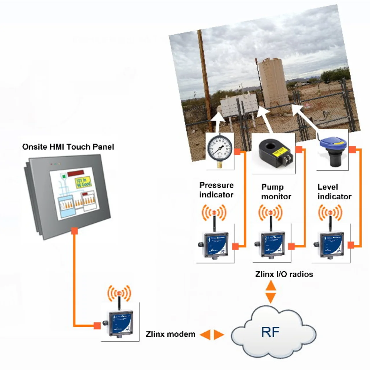 Bei einer Vorgängerversion meiner Anlage im Pinal County griff ich noch auf I/O-Funkgeräte zurück, um die Daten der Druck-, Strom- und Füllstandssensoren an ein Funkmodem zu übertragen. Das Funkmodem wurde dann an ein örtliches HMI angeschlossen (Abb. 1). So ließen sich alle Daten ganz bequem an einem einzigen Ort sammeln. Ich war zwar bereits ein wenig mit drahtlosen Datennetzwerk-Technologien vertraut, aber trotzdem musste ich physisch vor Ort anwesend sein, um die Ergebnisse zu prüfen.