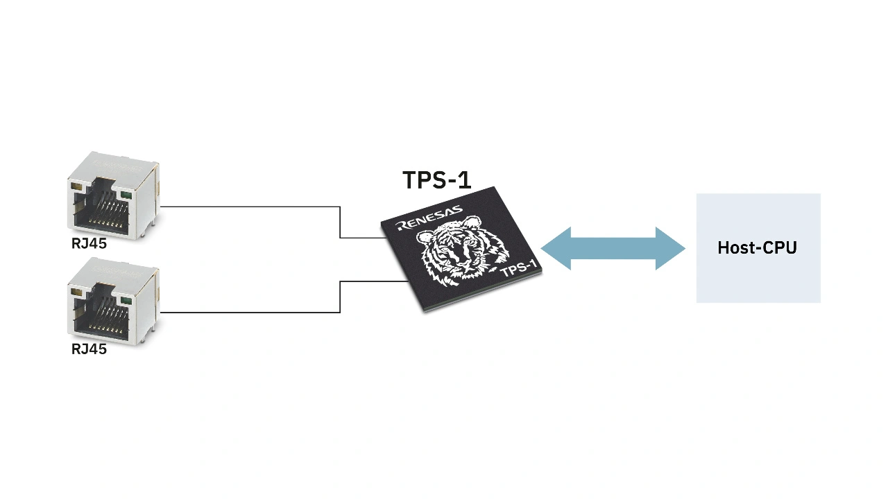 Eine typische Anwendung des TPS-1 als Profinet-Kommunikationscontroller setzt sich aus den Steckverbindern und Netzwerkübertragern sowie dem Chip und einer Host-CPU zusammen. Der Baustein umfasst zwei physische Schnittstellen (PHY), die mit einem Switch gekoppelt sind. Die TPS-1-interne CPU übernimmt einen Großteil der Bearbeitung der Profinet-Kommunikation und leitet die anwendungsspezifischen Daten an die Host-CPU weiter. Die Abarbeitung der Profinet-Kommunikation durch den TPS-1 entlastet die Host-CPU erheblich und schafft damit mehr Zeit für die Applikation und ihre Aufgaben.