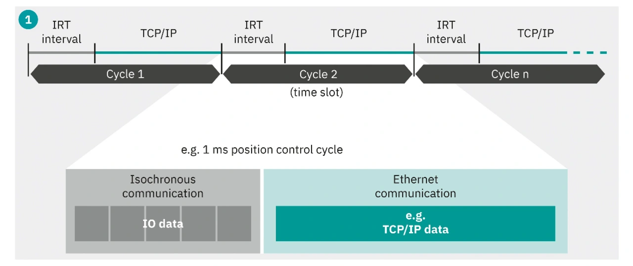 Zur Realisierung der hohen zeitlichen Anforderungen muss das Durchleiten von Nachrichten sehr genau getaktet werden. Dazu ist den zyklischen Daten in der Ethernet-Leitung eine höhere Priorität einzuräumen. Diese Anforderung lässt sich lösen, indem die zur Verfügung stehende Zeit in Zeitschlitze aufgeteilt wird. Eine typische Abfolge mehrerer Zyklen setzt sich immer aus einem grauen und einem grünen Bereich zusammen. In Bild 2 werden die nicht-priorisierten Daten als TCP/IP-Daten bezeichnet, wobei es um eine beliebige Ethernet-Übertragung gehen kann. Die Darstellung beschreibt einen einzelnen Zyklus. Die Zykluszeit des Beispiels beträgt 1 ms (Bild 2).