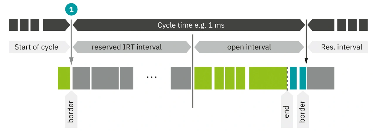 Der Zyklus beginnt mit dem grauen Intervall, in dem die zyklischen Daten zwischen dem Controller und dem Device ausgetauscht werden. Daran schließt sich das grüne Intervall an, das der Weiterleitung beliebiger Ethernet-Daten dient. Die interne Steuerungslogik des TPS-1 erkennt, ob am Ende des grünen Intervalls noch ein Ethernet-Frame übertragen werden kann oder ob der Transfer der nächsten Nachricht erst im folgenden Zyklus möglich ist. Dieses Verfahren wird beim TPS-1 durch die in den internen Switch implementierte Hardware unterstützt und gesteuert. Die Übermittlung aller nicht zu den zyklischen Daten gehörenden Profinet-Nachrichten findet im grünen Intervall statt. Dieser bei IRT eingeführte Mechanismus sorgt dafür, dass keine Nachrichten verfälscht oder geteilt werden. Die Nachrichten des grünen Bereichs sind nicht zeitkritisch und können notfalls bis zum nächsten Zyklus warten (Bild 3).