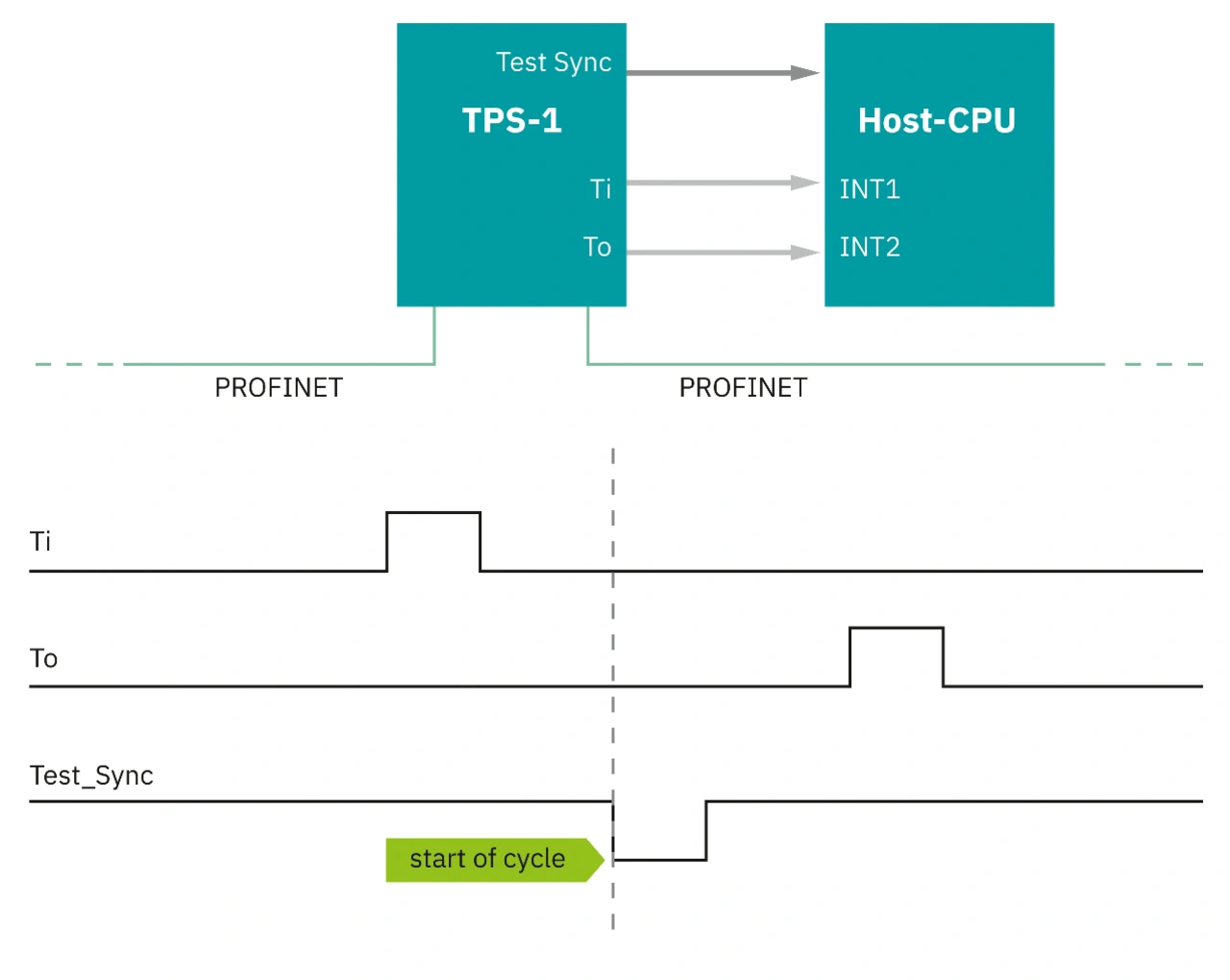 Das Signal Test_Sync zeigt bei der Inbetriebnahme an, dass sich der TPS-1 auf die IRT-Domäne synchronisiert hat. Dieses Signal ist für den Datenaustausch mit der Host-CPU bedeutungslos. Es wird bei der Zertifizierung getestet, um das richtige Verhalten der Synchronisierung zu kontrollieren.