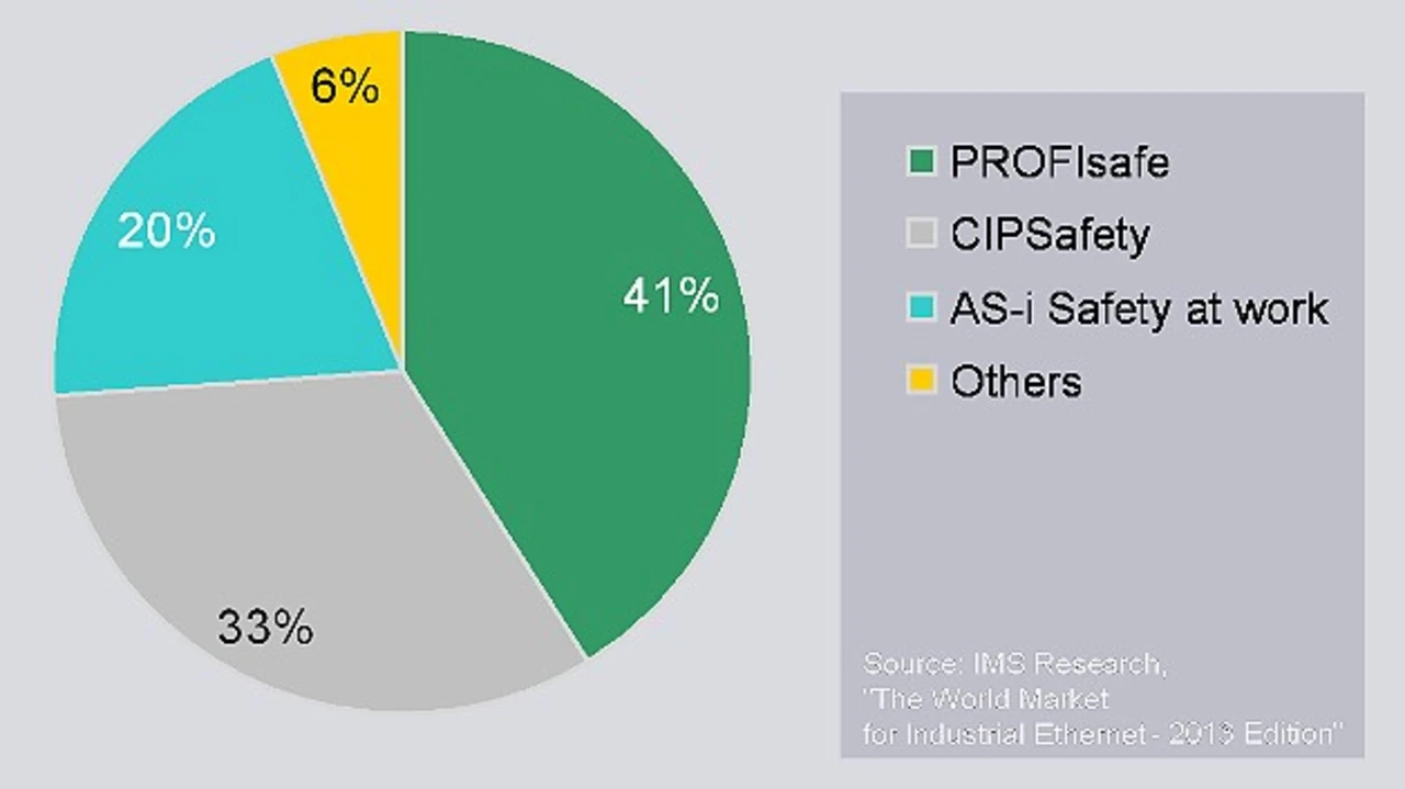 Unter den sicherheitsgerichteten Kommunikationsprotokollen hat Profisafe laut der von PI auf der Hannover Messe präsentierten Studie mit 41 Prozent Marktanteil die Nase vorn, gefolgt von CIP Safety mit 33 Prozent und AS-Interface Safety at Work mit 20 Prozent. Die übrigen Protokolle kommen zusammen auf 6 Prozent.