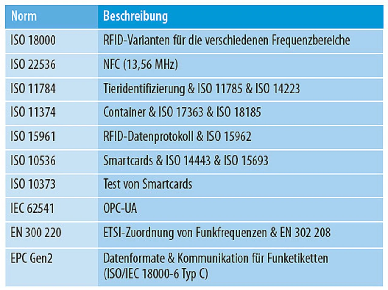 Damit RFID Tags und Lesegeräte herstellerunabhängig zusammenarbeiten, ist die Einhaltung von Standards wichtig. Tabelle 3 gibt einen Überblick über die wichtigsten Normen, die RFID betreffen. Im Jahr 2013 wurden etwa 6 Milliarden Funketiketten produziert. Bis 2020 könnten bis zu 50 Milliarden im Einsatz sein, bei einem Wachstum von derzeit 40 bis 50 % jährlich. Die Preise für Funketiketten sollen bis dahin auf etwa 20 % der heutigen Preise fallen. Das Problem sind nicht die Stückkosten von Funketiketten, sondern die individuell bereitzustellenden Infrastrukturen. In realen Anwendungen im industriellen Einsatz konnte schon eine Amortisation innerhalb von 18 oder 24 Monaten erreicht werden. Individuelle Anpassungen bei den Elementen eines RFID-Systems sind meist unumgänglich. Dafür werden praxiserfahrene Anbieter benötigt.