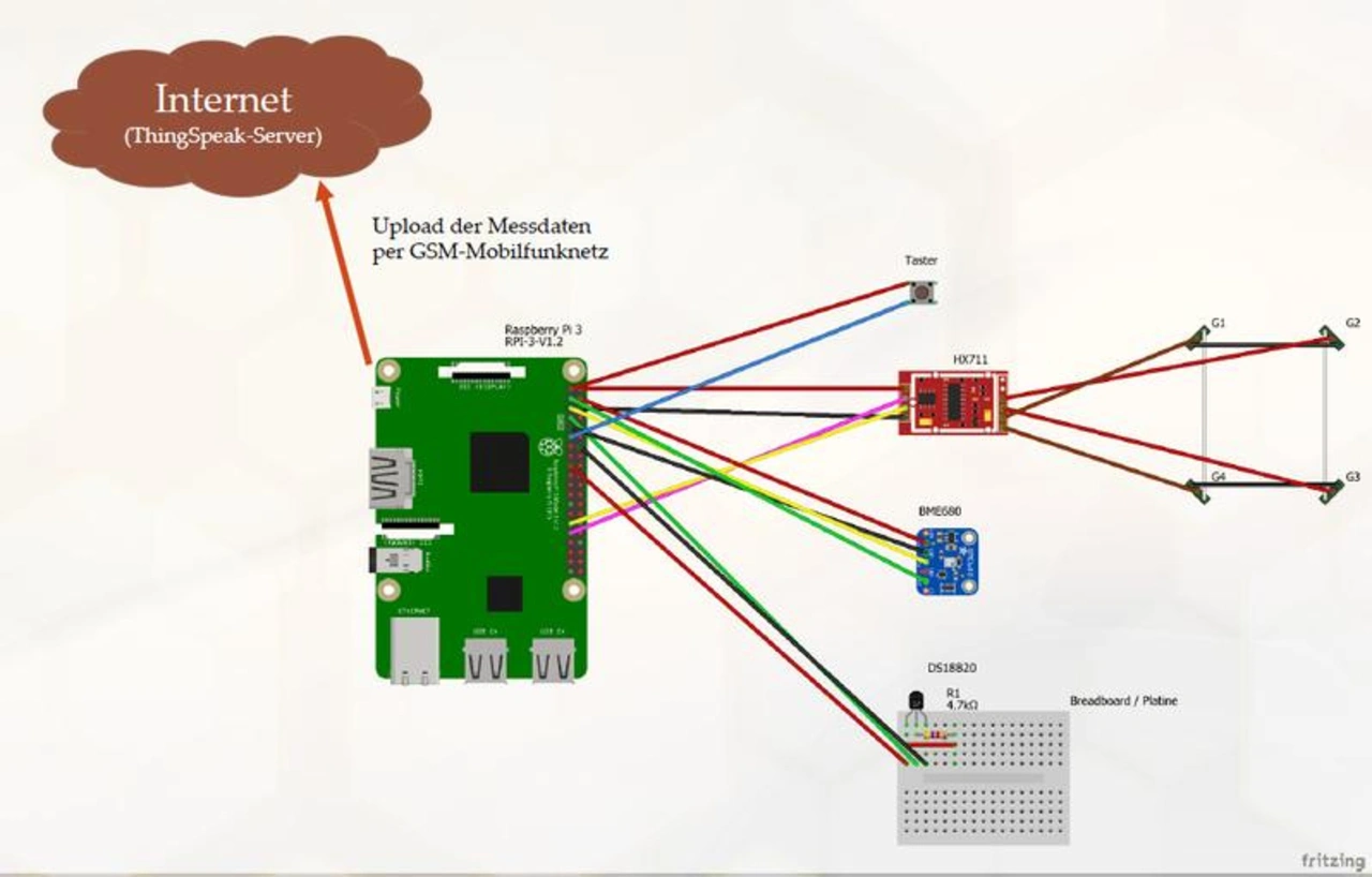 Die Messstation kann mit einem Solarpanel und einer Batterie autark am Bienenstand betrieben werden. Zusätzlich kann sich das Gerät über einen Surfstick mit dem Internet verbinden. Die Messdaten werden auf einem zentralen Webserver gespeichert, damit sie jederzeit von überall mit dem Smartphone abrufbar sind.