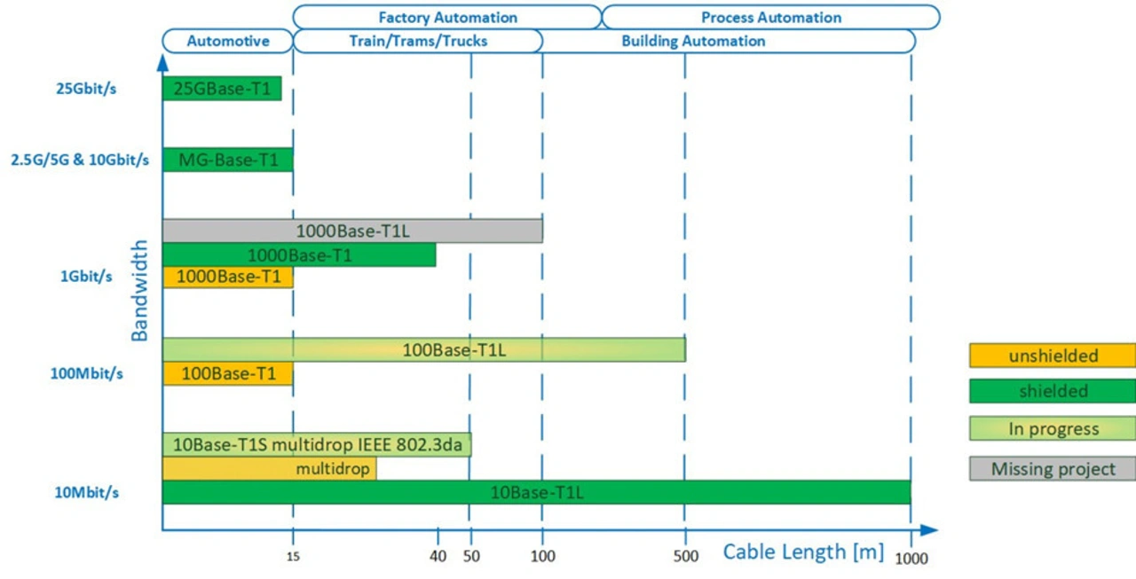 Es sind uns einige industrielle und mobile Anwendungen für 100 Mbit/s oder 1 Gbit/s bekannt, die von den Vorteilen der SPE-Technologie profitieren und größere Reichweiten benötigen würden. Beispiele dafür sind Landmaschinen und Passagierinformationssysteme in Zügen. Für die IEEE 802.3dg wurde bereits die Normung eines Linksegments von 1 Gbit/s über 100 m Kabellänge diskutiert, jedoch haben die an der Arbeitsgruppe beteiligten Unternehmen beschlossen, sich zunächst auf ein Linksegment von 100 Mbit/s über 500 m Reichweite zu konzentrieren. Im Fokus steht der Bedarf der APL-Feldswitches mit 100 Mbit/s, um Bandbreitenengpässe in die Steuerungs- und Prozessleitebene zu vermeiden.