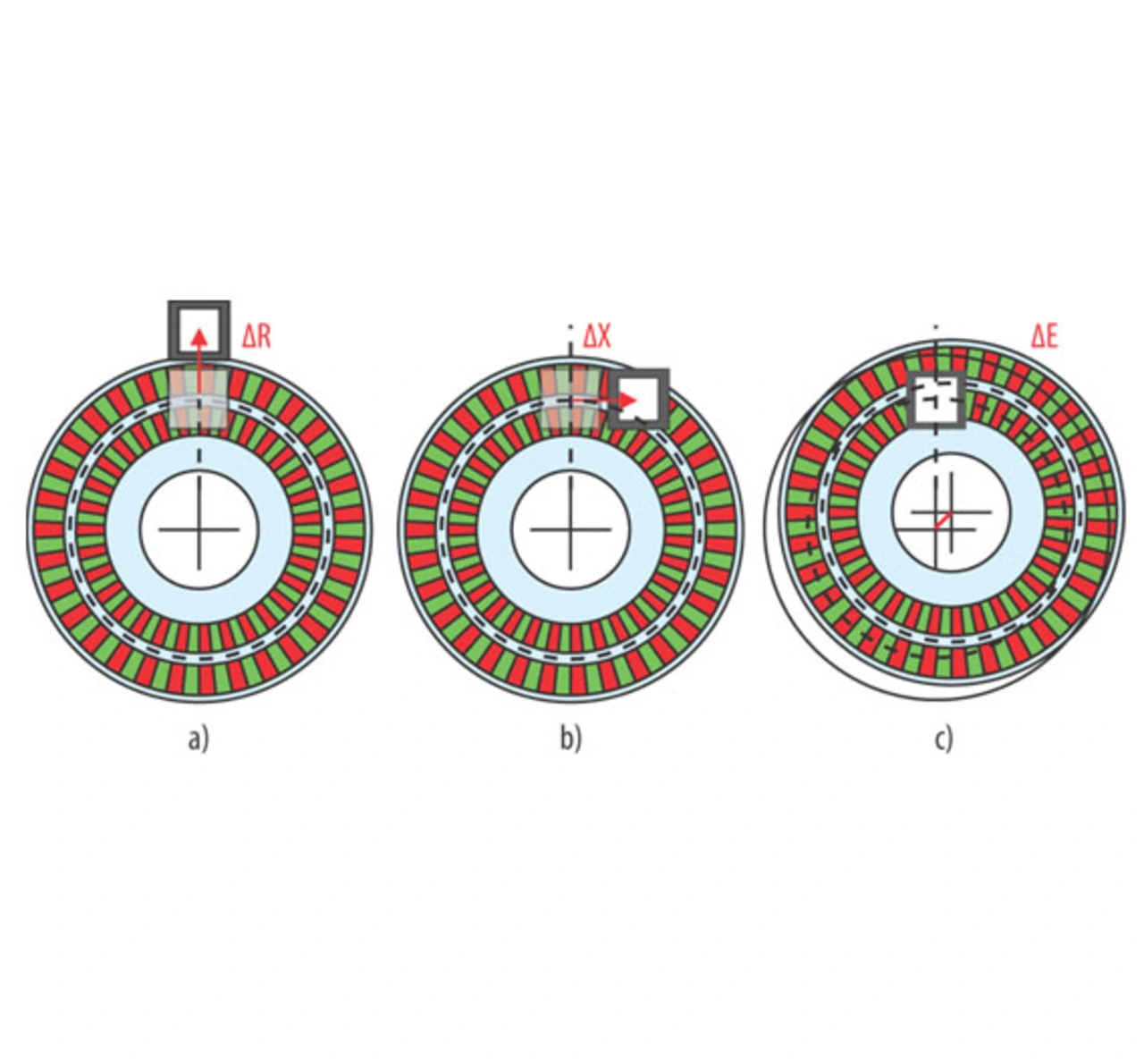 Allerdings verursacht eine exzen-trisch aufgebrachte Maßverkörperung (∆E) einen Taumel derselben (Bild 4c). Das Pitch-Maß der Maßverkörperung ändert sich umso stärker, je kleiner der Durchmesser ist. Ein langwelliger Fehler entsteht, der die absolute Messgenauigkeit reduziert.