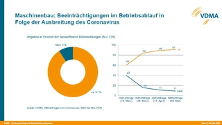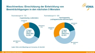 Die Corona-Pandemie ist im Maschinenbau inzwischen flächendeckend zu spüren, hat der VDMA mit Sitz in Frankfurt am Main in seiner jüngsten Blitzumfrage festgestellt. Neun von zehn Betrieben sehen sich als Betroffene der wirtschaftlichen Folgen der Pandemie, lautet das Ergebnis der vierten VDMA Blitzumfrage unter seinen Mitgliedsfirmen. »Zunehmende Sorgen bereitet den Maschinenbaufirmen dabei die Nachfrageseite«, erklärt VDMA-Chefvolkswirt Dr. Ralph Wiechers. »Bereits Mitte April hatten gut drei Viertel der Befragten merkliche oder gravierende Auftragseinbußen beziehungsweise Stornierungen verbucht, Anfang Mai kletterte dieser Wert nochmals auf 85 % nach oben«, erläutert er.