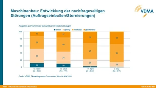 Vor große Probleme werden die Betriebe dagegen durch Reise- und Aufenthaltsbeschränkungen gestellt. Mehr als 80 % der befragten Unternehmen gaben an, dass Aufenthaltsgenehmigungen nicht erteilt werden oder ihren Mitarbeitern kein Zutritt zum Werksgelände ihrer Kunden gewährt wird. Außerdem verzögern oder verweigern 62 % der Kunden die Abnahme gelieferter Maschinen, 43 % der Maschinenbauer geben Liquiditätsengpässe an. Jeweils fast ein Drittel der Unternehmen sehen zudem Erschwernisse in der Transport- und Logistikabwicklung oder durch Gesundheits- und Hygieneauflagen.