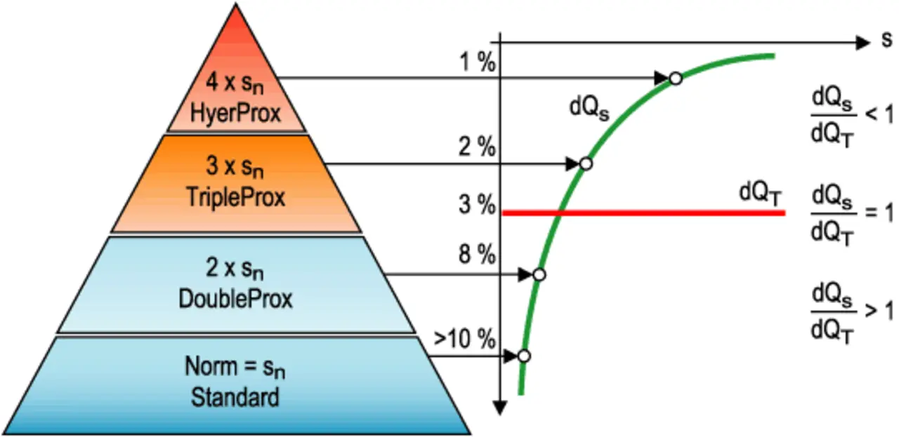 Dank moderner Fertigungstechnik und modular einsetzbarer ASICs lassen sich die Näherungssensoren der Serie „HyperProx“ mit vierfachem Standardschaltabstand unter Serienbedingungen herstellen. Angeboten werden zur Zeit Ausführungen im M12-, M8- und D6,5-Gehäuse, die jeweils den so genannten „doppelten Schaltabstand“ des Standardsensors der jeweils nächsthöheren Sensorbauform realisieren. Das heißt beispielsweise, dass ein M12-Sensor der Sensorfamile „HyperProx“ denselben Schaltabstand (8 mm) wie ein M18-Sensor der Reihe „DoubleProx“ hat.