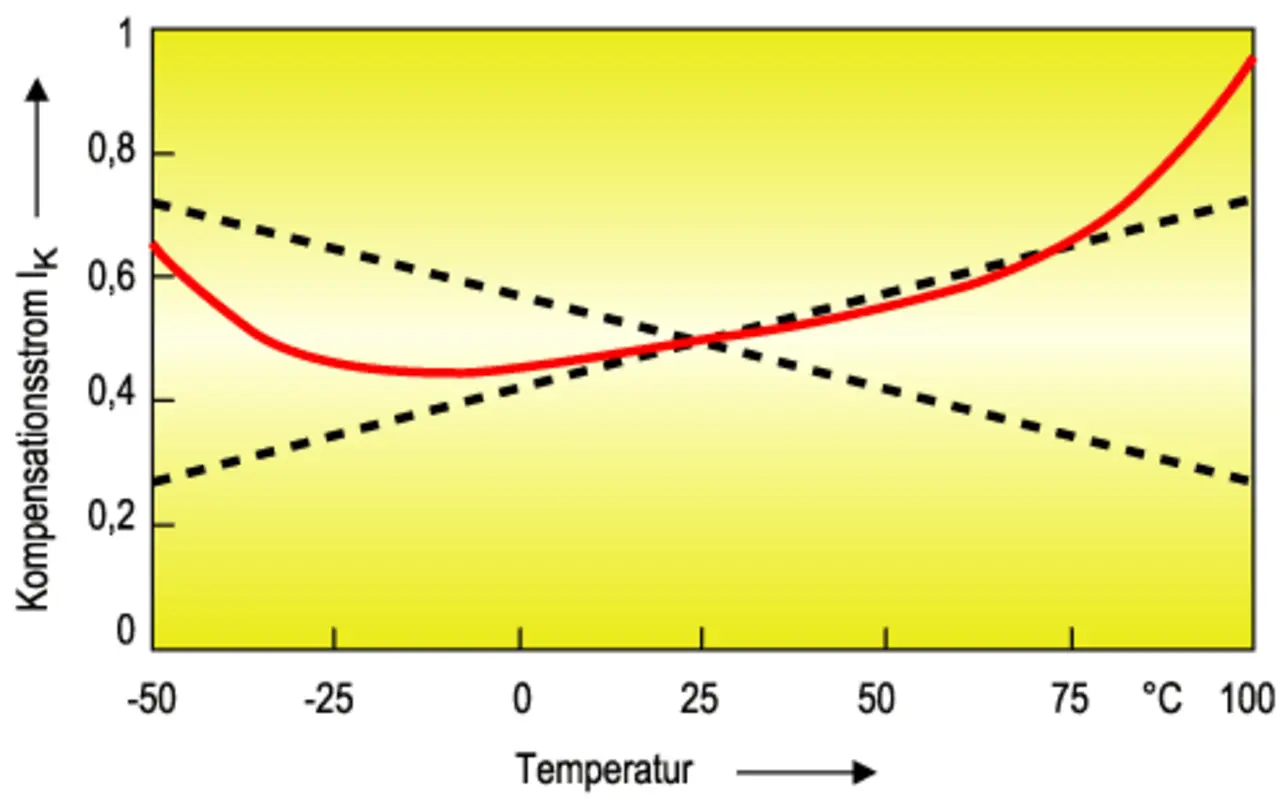 Eine entsprechende Bauteileauswahl und Konstruktion genügen jedoch nicht, um unter den gegebenen Bedingungen eine praxisgerechte Tempera-turstabilität der Sensoren zu gewährleis-ten. Deshalb wurden auf einem ASIC, auf dem auch die Oszillatorschaltung untergebracht ist, ein Temperaturfühler und eine aktive Temperaturkompensation integriert. Diese zweite Stufe TEMPKO 2 der Temperaturkompensation besteht im Prinzip aus drei voneinander unabhängigen, temperaturgesteuerten Widerstandsnetzwerken [5]. Durch eine gewichtete Addition der jeweiligen Ausgangsströme lässt sich der Temperaturgang des Oszillator/Demodulator-Ausgangssignals und dadurch der Auswerteelektronik nahezu vollständig kompensieren. Um die Gewichtung festzulegen, wird eine typspezifische Sollwertkurve ermittelt und durch die Widerstände im Netzwerk nachgebildet. Damit lassen sich, anders wie bei sonst üblicher Kompensation mit NTC- und PTC-Widerständen, nahezu alle relevanten Verläufe des Kompensationsstroms Ik realisieren (Bild 4).