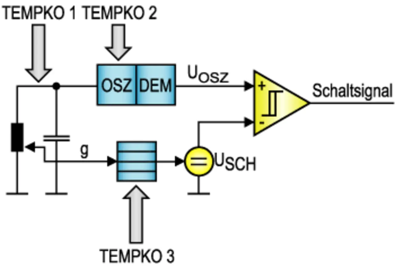Der Einschaltpunkt eines induktiven Näherungssensors wird durch einen Komparator bestimmt. Die Eingangssignale dieses Komparators sind einerseits eine der Oszillatoramplitu-de proportionale Gleichspannung UOSZ und ande-rerseits die so genannte Komparatorschaltschwelle USCH. Die dritte Stufe der Tempe-raturkompensation TEMPKO 3 wirkt über diese Schaltschwelle [5, 10, 11, 12]. Abhängig von der im Sensorinneren in Spulennähe gemessenen Temperatur wird der Spannungs-wert dieser Schaltschwelle korrigiert (Bild 5). Dazu werden nach der Endmontage für jeden Sensor Korrekturwerte für die Temperaturkompensation in einer Zuordnungstabelle in einem Sensor-ASIC hinterlegt. Programmiert wird dieses ASIC ebenfalls über die Versorgungsleitungen. Im praktischen Betrieb adressiert der integrierte Temperatursensor jeweils den entsprechenden Speicherplatz der Zuordnungstabelle, die den Korrekturwert für den realen Schaltabstand ausgibt.