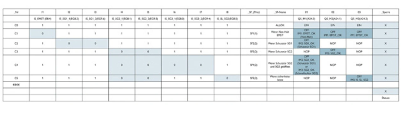 Diese Aussage belegt auch der Forschungsbericht des Projekts „Normgerechte Entwicklung und Dokumentation sicherheitsbezogener Anwendungs-Software im Maschinenbau“ (FF-FP 0319) der Hochschule Bonn-Rhein-Sieg, gefördert von der Deutschen Gesetzlichen Unfallversicherung (DGUV). Als ein Ergebnis des Projekts kristallisierte sich für die Spezifikation eine Art Matrixmethode heraus, die auch den beteiligten Industrieunternehmen als praktikabelste erscheint, weil Softwarespezifikationen in Tabellenform teilweise schon angewendet werden. Um die „Matrixmethode des IFA“ und die Erkenntnisse des Projekts praxisbezogen zu realisieren, rief das IFA seinerzeit das Projekt Softema ins Leben. Als Software-Assistent verwirklicht Softema die Anforderungen von DIN EN ISO 13849, lässt sich allerdings nur bedingt im Rahmen von EN ISO 62061 verwenden.