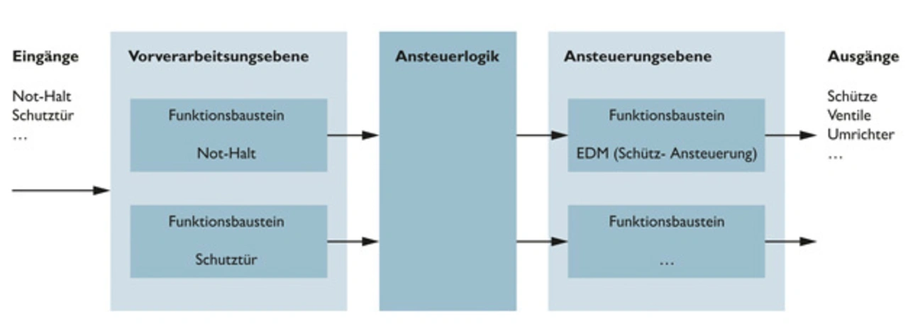 Das Arbeiten mit Softema beruht auf Microsoft-Excel-Arbeitsblättern, die wahlweise mit dem Tabellenkalkulationsprogramm oder mit Softema ausgefüllt werden können. In der Spezifikationsphase kann der Entwickler das von ihm erzeugte Programm auf mehreren Excel-Arbeitsblättern beschreiben – von der Spezifikation der Sicherheitsfunktion über die I/O-Belegung und die Software-Architektur mit Nutzung der Vorverarbeitungs- und Ansteuerungs-Ebene bis zur Cause-and-Effect-Matrix. Die Ansteuerlogik wird auf Basis der Cause-and-Effect-Matrix programmiert (Bild 2). Meist setzt die Arbeit mit Softema voraus, dass die Vorverarbeitungs- und Ansteuerungs-Ebene mit vorgefertigten Funktionsbausteinen realisiert werden (Bild 3).