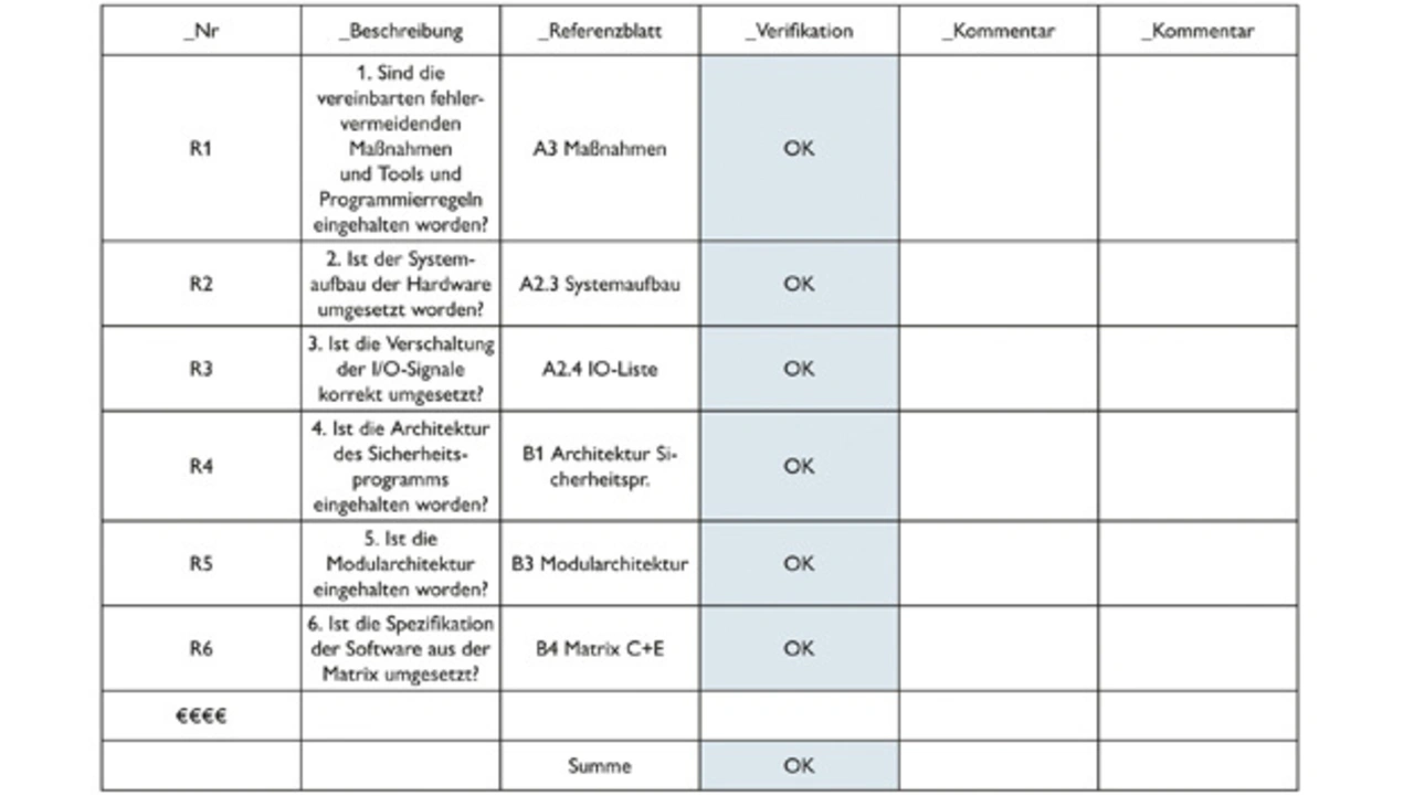 Um die Software auf den verschiedenen Ebenen effizient testen zu können, hilft Softema ebenfalls den Prüfern. Hierzu werden die Spezifikations-Arbeitsblätter wiederverwendet und ausschließlich um Prüfspalten erweitert. Zur Vervollständigung der Tests – wie beispielsweise Code-Review und Validierung – sowie von deren Dokumentation stehen zusätzliche Arbeitsblätter zur Verfügung (Bild 4). Seit Frühjahr 2019 liegt der Software-Assistent als Beta-Version für einen eingeschränkten Kreis von rund 300 Nutzern vor. Um wertvolle Erkenntnisse für die Weiterentwicklung zu sammeln, wird Softema derzeit in einer lang angelegten Testphase den ersten praktischen Prüfungen unterzogen.