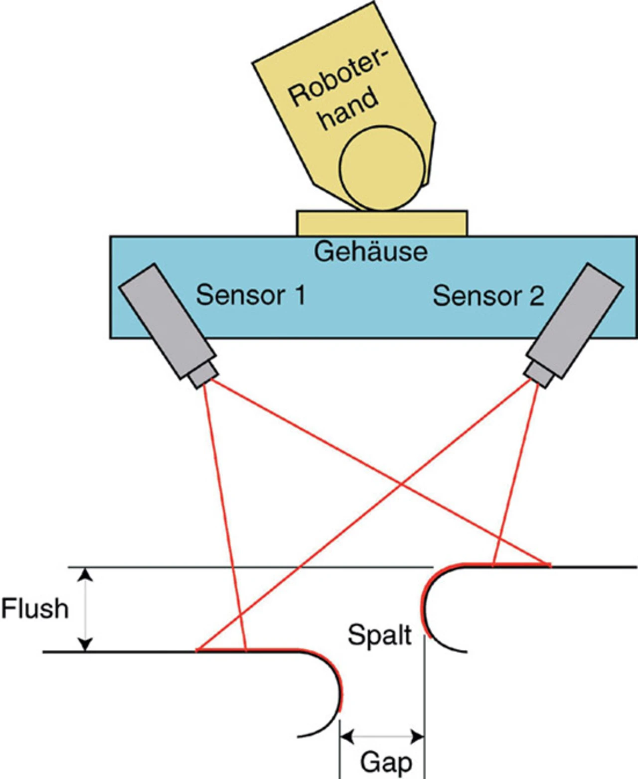 Um Karosseriespalten vermessen zu können, die bei roboterbasierter Montage entstehen, haben die Automobilhersteller verschiedene Messgrößen festgelegt. Die beiden wichtigsten sind die Breite des Spaltes (Gap) und der Versatz der Ebenen auf beiden Seiten des Spaltes (Flush). Um Gap und Flush korrekt zu bestimmen, ist es nötig, die Rundung der Bleche ein Stück weit in den Spalt hinein zu vermessen. Diese Aufgabe übernehmen spezielle Doppel- Lichtschnittsensoren, die den Spalt mit sich kreuzenden Achsen messen.