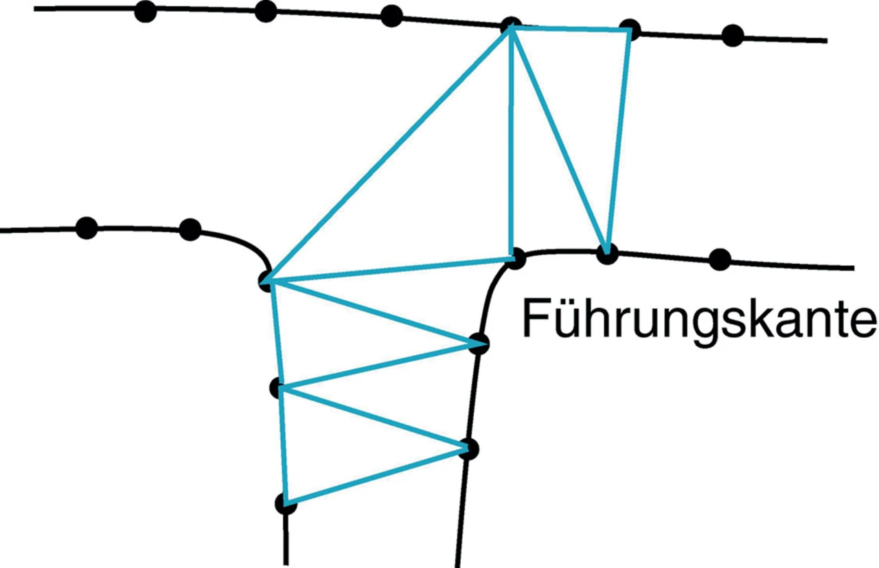 Die Benutzung der beiden geometrisch nächstliegenden Punkt der Gegenkante hat einen großen Vorteil: Dieser einfache Algorithmus führt dazu, dass auch an einer Verzweigung automatisch die richtigen Messpunkte benutzt werden, da die Messpunkte des nicht weiter verfolgten Zweiges zu weit von der Führungskante entfernt sind. Eine gesonderte Erkennung und Behandlung von Verzweigungen ist somit obsolet.