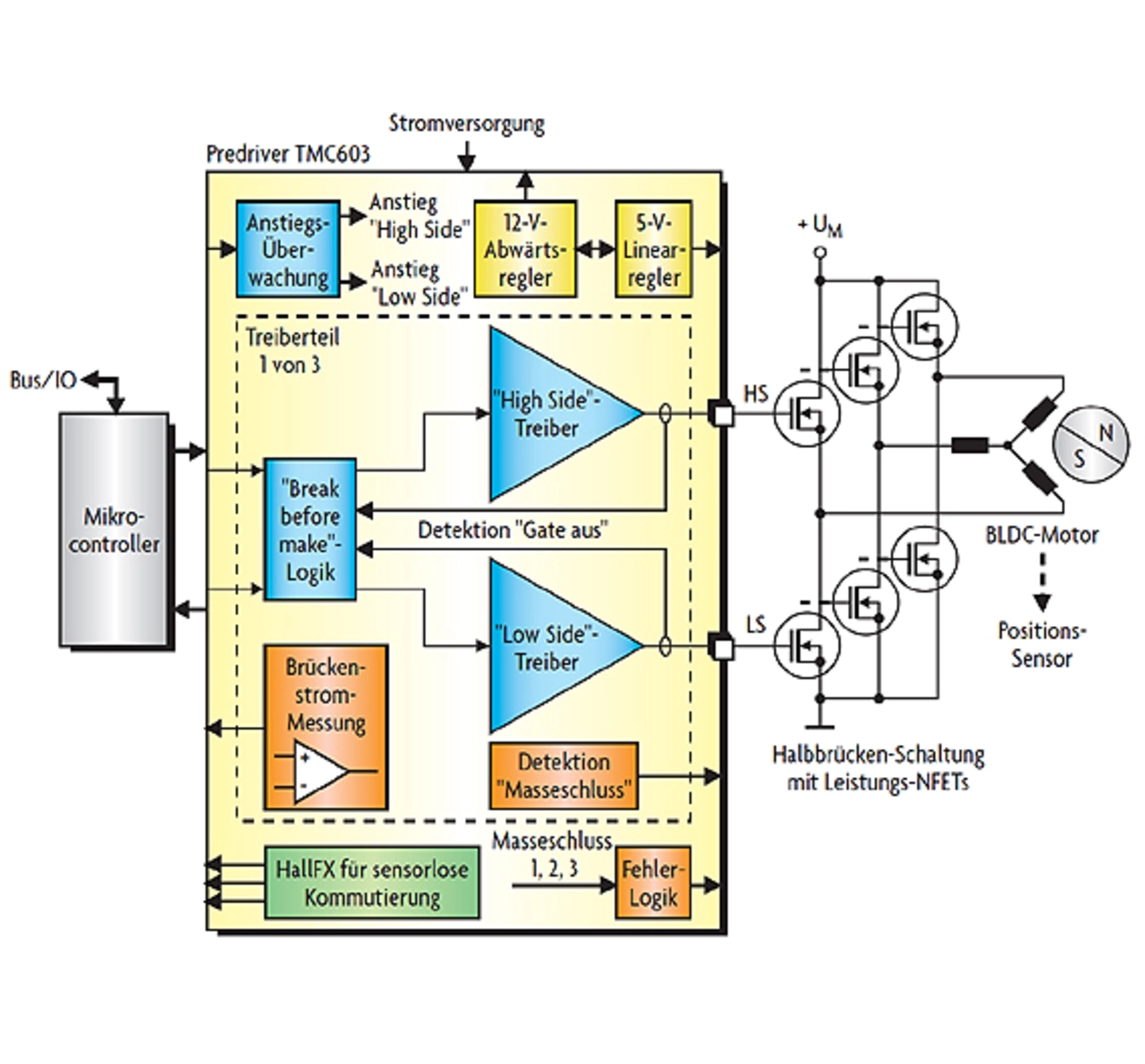 Der Systemdesigner sieht sich immer häufiger vor der Fragestellung, ob die Aufgabe der Motoransteuerung auf einer Hauptplatine zentral realisiert werden soll oder ob ein mechatronischer Ansatz gewählt wird, bei dem Motor und Elektronik zu einer Einheit zusammengefasst werden. Der dezentrale Ansatz scheint auf den ersten Blick attraktiv, scheitert jedoch leicht an den „Nebenkosten“ für die Stromversorgung, dem zusätzlich erforderlichen leistungsfähigen Controller und einem zu großem Bauraum bei diskreter Realisierung. Der TMC603 ist für beide Konzepte gerüstet: Er kann relativ kostengünstige Mikrocontroller zur einfachen block-kommutierten Ansteuerung eines BLDC-Motors ergänzen, unterstützt aber auch durch entsprechende Messwert-Aufbereitung aufwendige sinus-kommutierte Systeme.