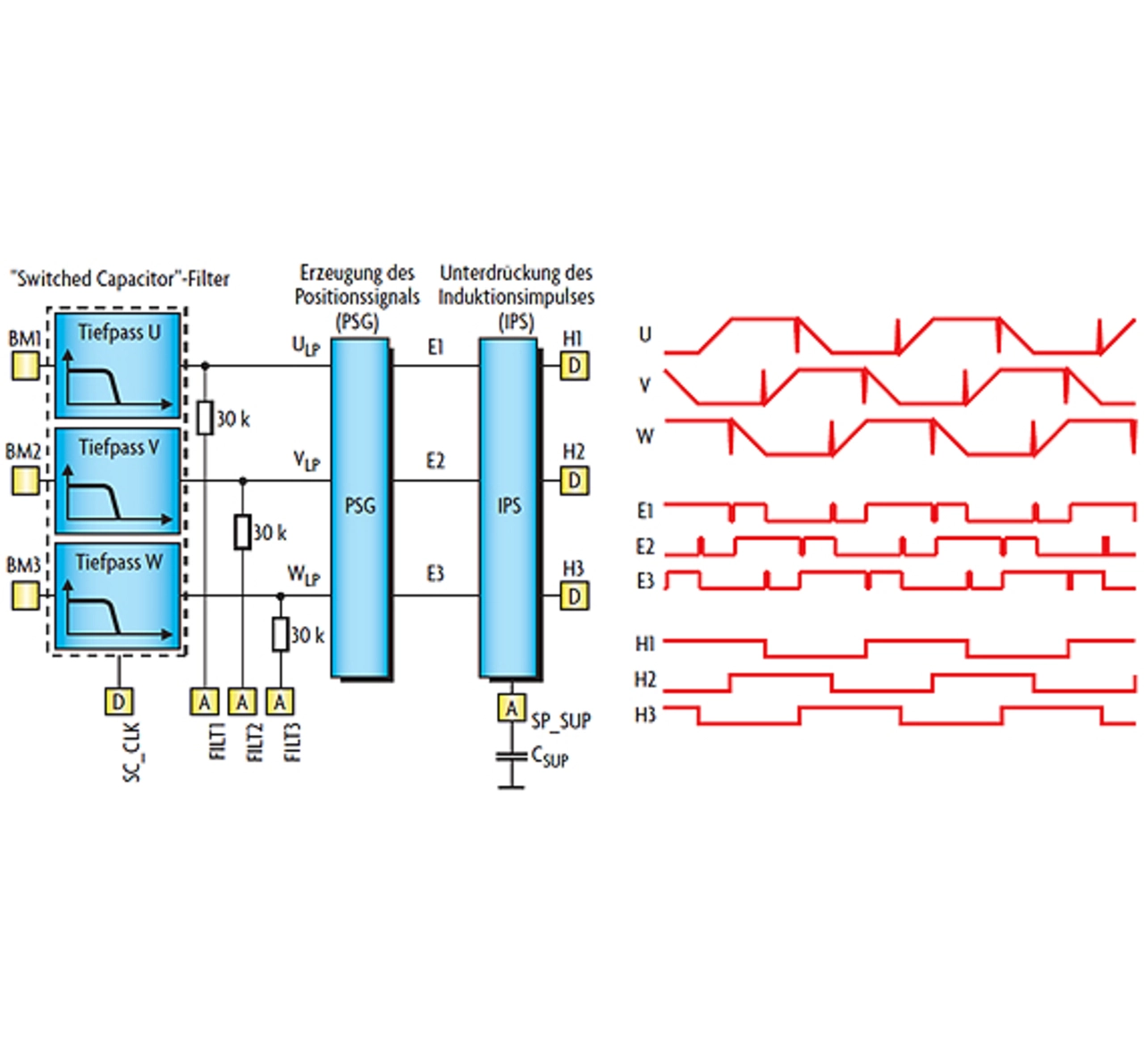 Ein „Switched Capacitor“-Filter stellt dazu die benötigten effektiven Spulenspannungen zur Verfügung. Die Filterfrequenz kann auf die Chopper-Frequenz und die maximale Drehzahl abgestimmt werden. Ein Totzeit-Generator blendet den Umschalt-Spike aus. Diese Umschalt-Spikes entstehen bei Block-Kommutierung durch das Trennen einer Phase von der Versorgung, so dass die in der Spule gespeicherte Energie als Induktionsspannung sichtbar wird. Die Induktionsspannung wird durch die Bulk-Dioden der MOSFETs in die Stromversorgung zurückgeführt. Die Dauer dieses Induktionsimpulses ist abhängig von der Induktivität des Motors und von der mechanischen Last, d.h. vom Strom zum Zeitpunkt des Trennens der betreffenden Spule.