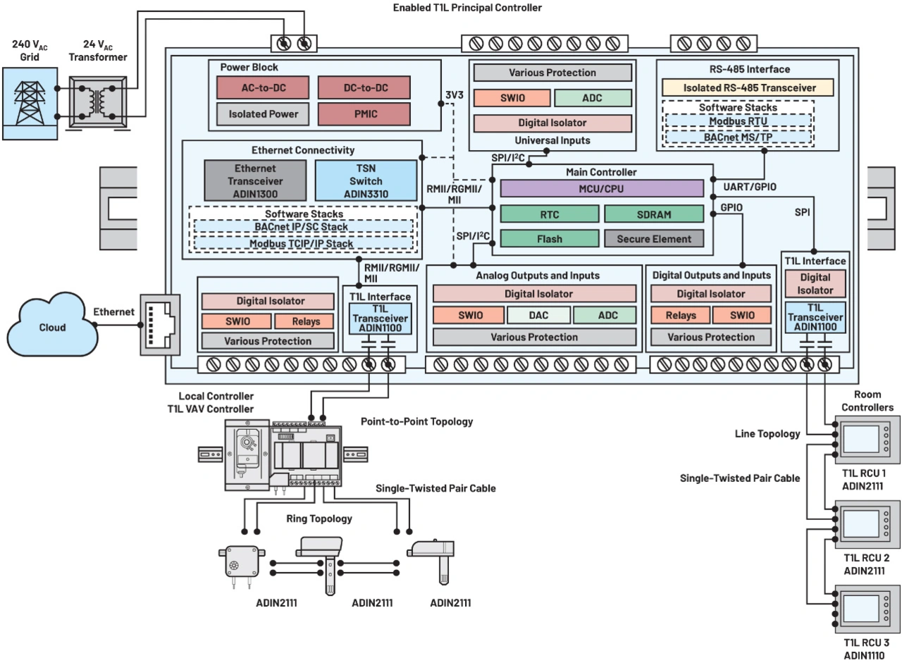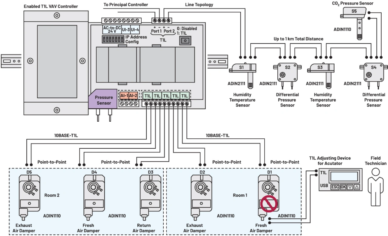 DDC-Systeme sind für die moderne Gebäudeleittechnik von essenzieller Bedeutung, denn sie ermöglichen die Echtzeit-Überwachung und -Regelung verschiedenster Gebäudesysteme. Im Zuge des technischen Fortschritts werden DDCs mit Ethernet-Anbindung weiter an Verbreitung gewinnen, wovon die Effizienz und die Sicherheit von Gebäuden gleichermaßen profitieren werden. Der PHY-Baustein ADIN1100, der MAC PHY ADIN1110 und der Dual-Port-Switch ADIN2111 von Analog Devices (ADI) eignen sich gut, um DDC-Systeme mit 10BASE-T1L-Funktionalität auszustatten. Diese Technik ermöglicht die Übertragung von Prozessgrößen, Konfigurations-Daten, Software-Updates und Diagnosedaten, was das Management und die Instandhaltung von Gebäudesystemen vereinfacht. 10BASE-T1L unterstützt Kabelstrecken bis 1 km und wartet mit Diagnose-Features auf, die ein ebenso rasches wie effizientes Beheben etwaiger Störungen erlauben. Die Integration von 10BASE-T1L mit Software-Stacks wie etwa Modbus IP oder BACnet IP ergibt eine umfassende Lösung für industrielle Automatisierungssysteme und erleichtert die effiziente Datenerfassung, die Gerätesteuerung und die Systemüberwachung. Bild 1 macht deutlich, wie 10BASE-T1L-Produkte in Heizungs-, Lüftungs- und Klimaregelungen (HLK) sowie Raumcontroller integriert werden können, um über ein ring- oder linienförmiges Netzwerk die Kommunikation mit mehreren Raum- oder Gebäudereglern zu ermöglichen.