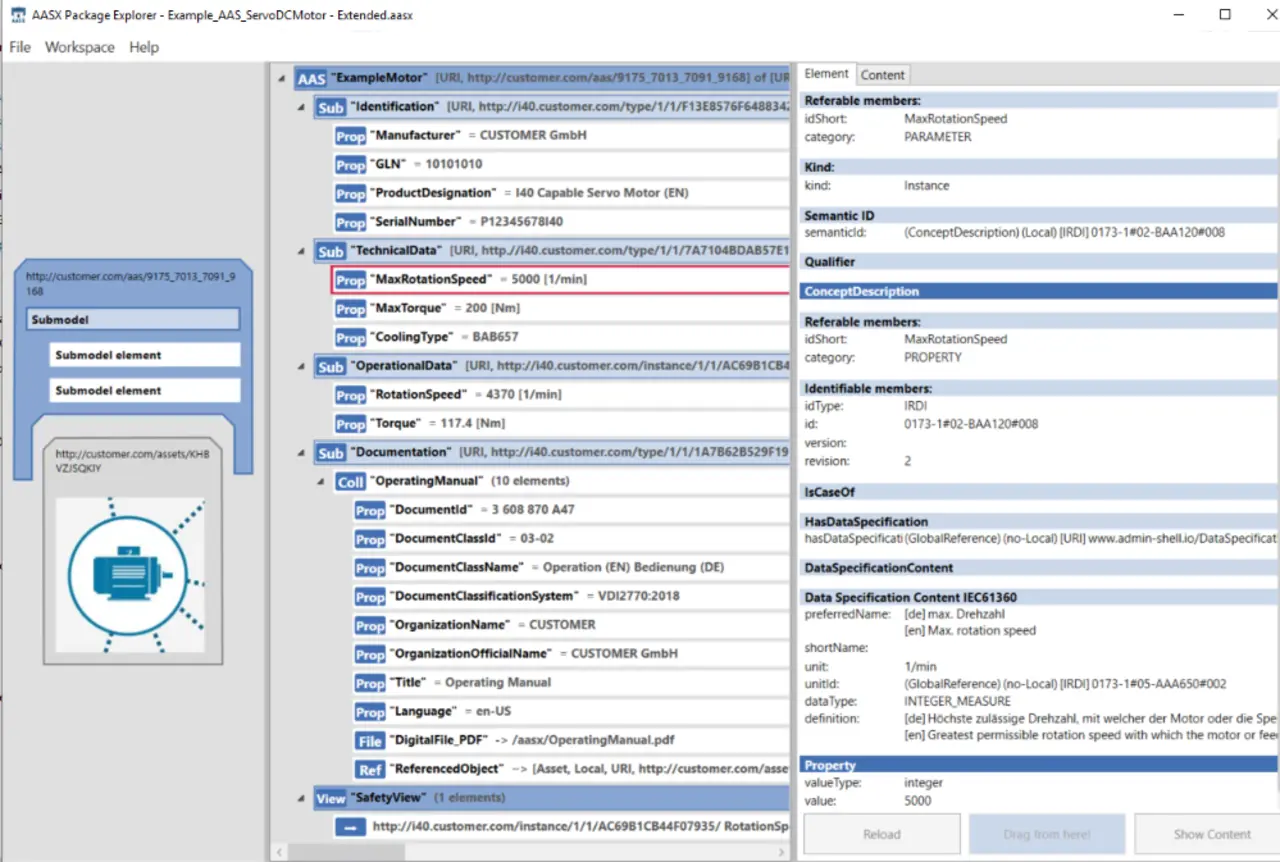 Der AASX Package Explorer ist ein Software-Tool, mit dem Unternehmen Verwaltungsschalen in den Formaten XML und JSON erzeugen und leicht editieren können – ausgehend vom eigenen geschäftichen Anwendungsfall. Konzeptbeschreibungen werden mit eCl@ss IRDIs automatisch angelegt und referenziert. Mit Import- und Export-Funktionen für z.B. BMEcat, AutomationML oder OPC UA können sehr schnell andere Datenformate und relevante Firmendaten integriert werden.