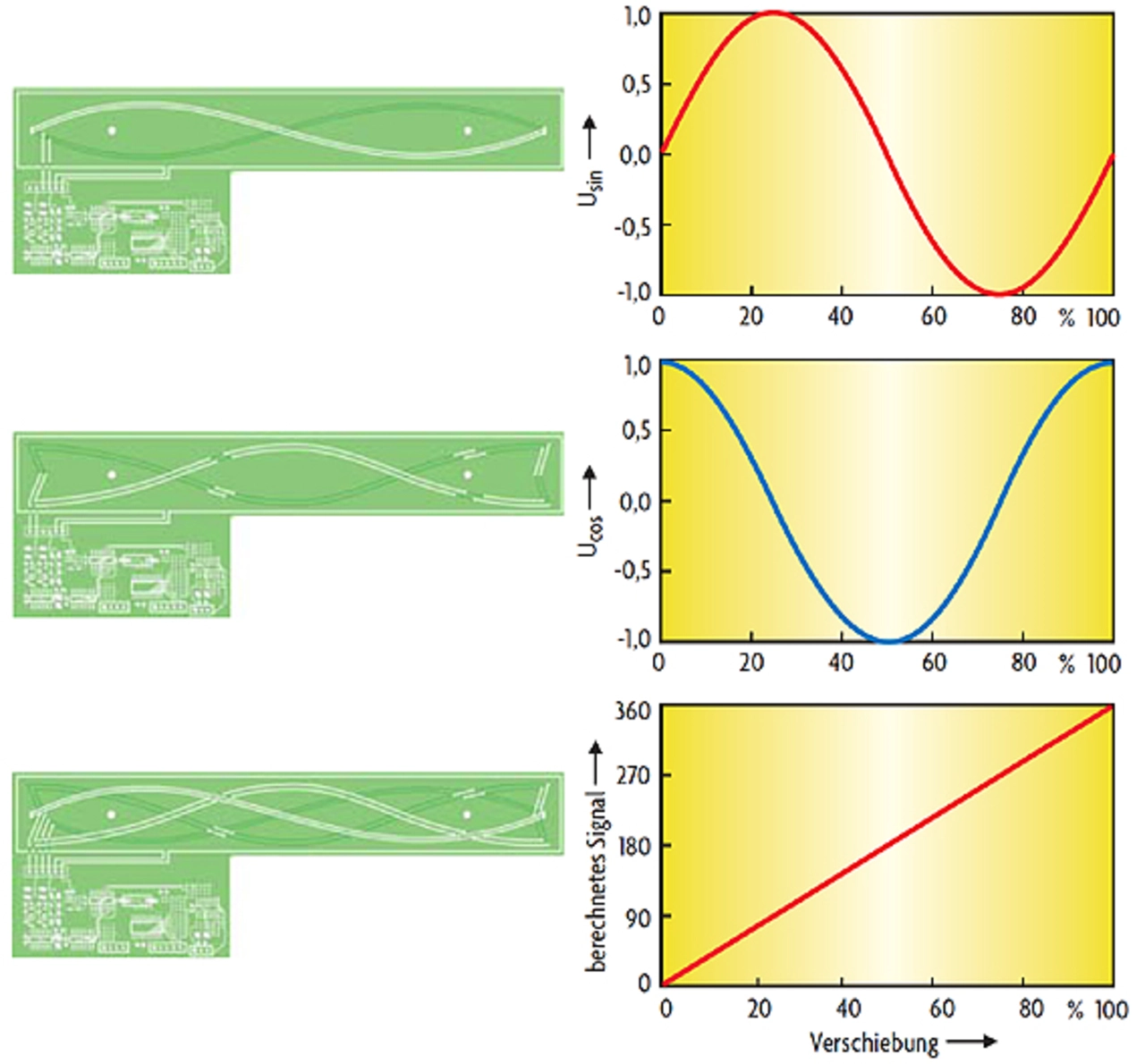 Der erste Unterschied wird bei der Betrachtung der Sinus-Spule deutlich (Bild 1, oben). Da sich die Leiterbahnen in ganz bestimmter Weise in der Mitte der Spule kreuzen, werden in den zwei Spulenhälften gegenphasige Ströme induziert, die sich gegenseitig aufheben. Dies gilt auch für die Cosinus- Spule (Bild 1, mitte), bei der sich der in der zentralen Wicklung induzierte Strom und die in den zwei Endwicklungen induzierten Ströme gegenseitig aufheben. In der Praxis sind aufgrund von Störeinflüssen an den Sensor- Enden kleinere Design-Änderungen notwendig, um die Cosinus-Spule »auszubalancieren«. Wird nun ein Positionsgeber wenige Millimeter über einem solchen Sensor positioniert, dann hängt die Größe der induzierten Ströme von dessen Lage und der Spulengeometrie ab. Da es sich um sinusförmige Signale handelt, erhält man mit der Berechnung des Quotienten und des arctan(ϕ) ein lineares Ausgangssignal (Bild 1, unten).