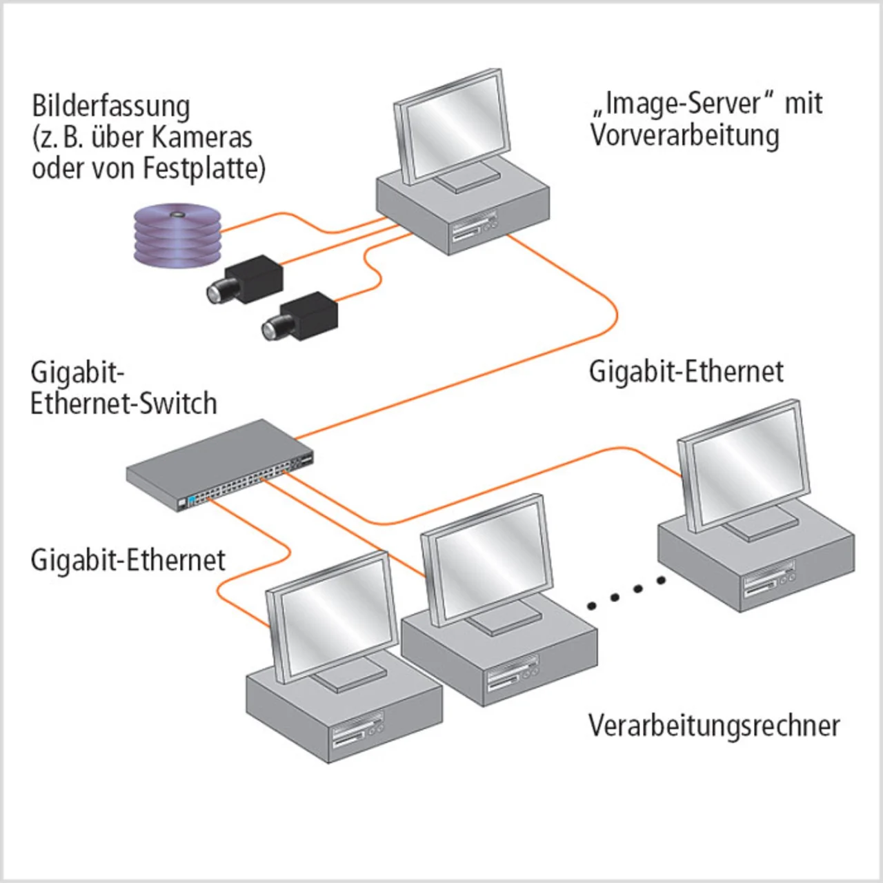 Zudem läuft die gesamte Kommunikation zwischen Bild-Server und Verarbeitungsrechner allein über das standardisierte GigE-Vision-Format – ohne proprietäre Protokolle oder zusätzliche Kabelverbindungen. Zwischen Bild-Server und Auswerterechner genügt allein die Gigabit-Ethernet-Verbindung. Damit gehören – zumindest unter Zuhilfenahme erschwinglicher Glasfaser-Netzwerk-Technologie – Kabellängenprobleme endgültig der Vergangenheit an. im