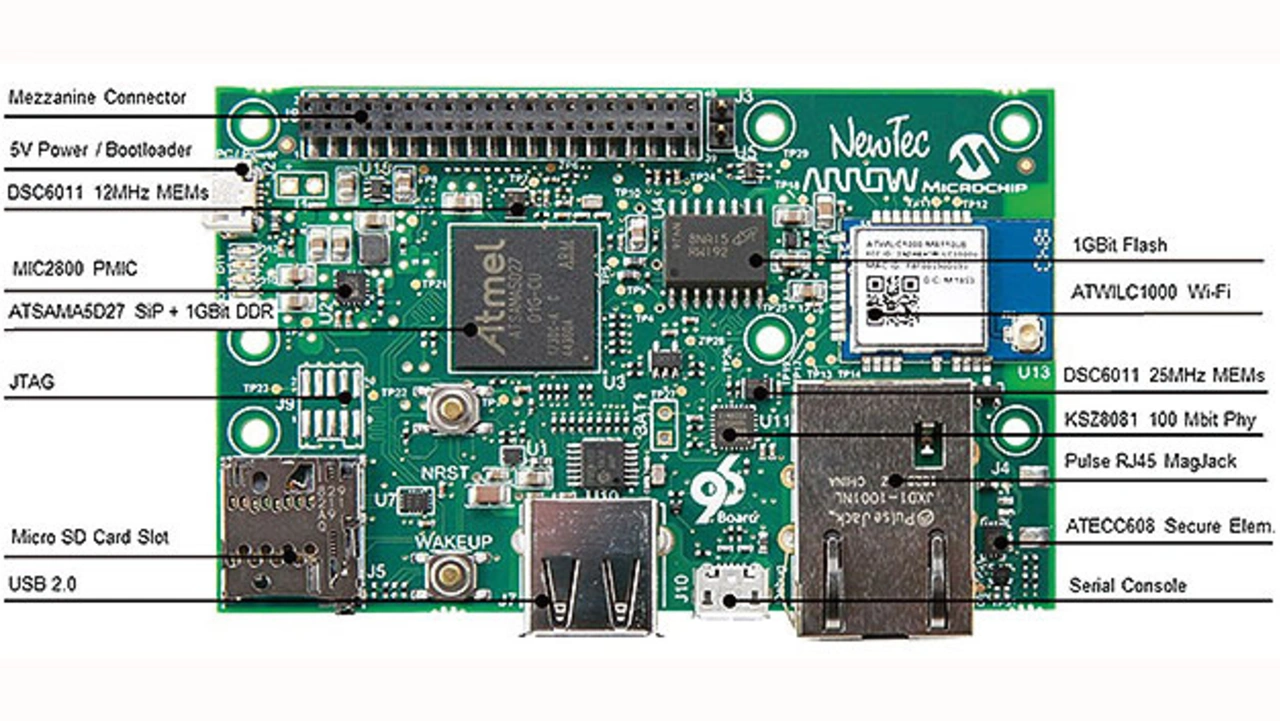 Das Board ist im »96Boards-Community-IoT-Extended«-Formfaktor von 54 x 85 mm2 ausgeführt (Bild 2). Es umfasst weitere Halbleiterbausteine/ICs von Microchip für Powermanagement, Clocking, 100Base-T-Ethernet, Wi-Fi, USB-Schnittstellen sowie passive elektromechanische Steckerbinder ausgewählter Hersteller. Zusätzlich lässt sich das Board über den 2x20-Pin-I/O-Steckverbinder mit Mezzanine-Karten erweitern. Abgerundet wird das Konzept mit einem 1 Gbit großen QSPI-Flash-Speicher der Firma Micron.
