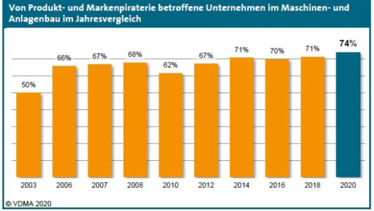 Alle zwei Jahre befragt der VDMA seine Mitgliedsfirmen zu den Bedrohungen und Auswirkungen von Fälschungen. In der aktuellen Studie, die vom Fraunhofer-Institut für Angewandte und Integrierte Sicherheit AISEC im Auftrag des VDMA erstellt wurde, gaben 74 Prozent der befragten Unternehmen an, von Produktpiraterie betroffen zu sein. In Unternehmen mit mehr als 500 Mitarbeitern lag der Anteil sogar bei 90 Prozent – beides sind neue Höchstwerte.