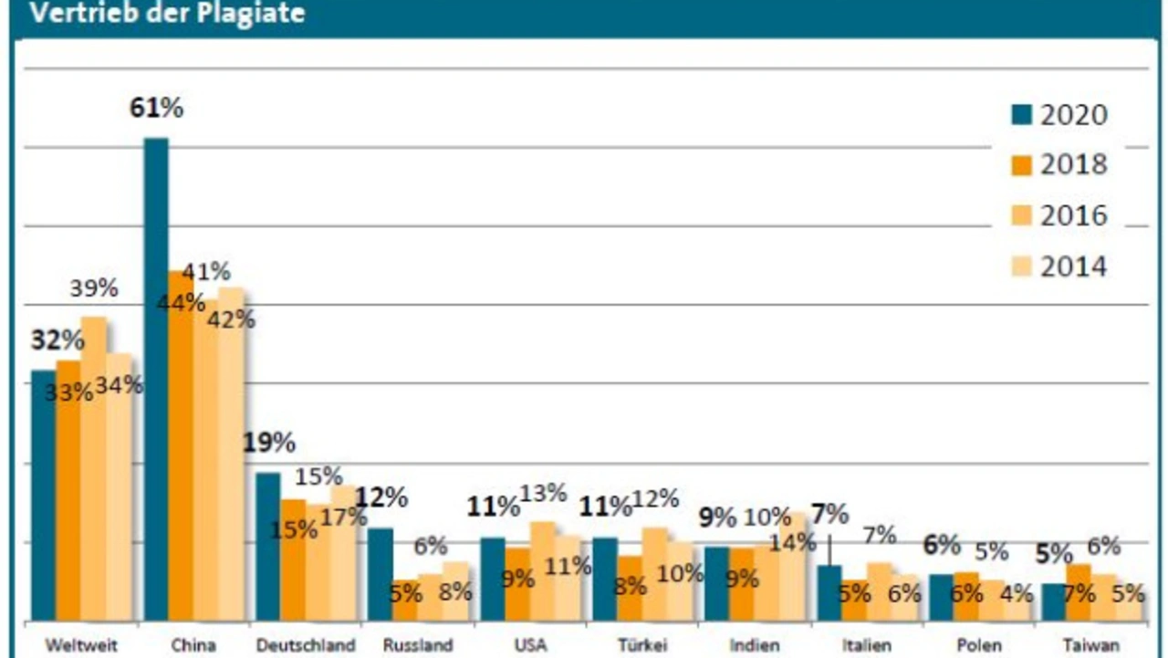 »Eine Trendwende ist ebenfalls in der gefühlten Bedrohung durch Fälscher zu erkennen. War der Wert zuletzt auf 39 Prozent gesunken, so sprachen nunmehr 52 Prozent der Befragten von einer Zunahme des wahrgenommenen Bedrohungsniveaus«, so Zimmermann. Besonders stark blüht der Handel mit gefälschten Maschinen und Komponenten in China, die Volksrepublik wird als wichtigstes Vertriebsland für Plagiate genannt (61 Prozent), gefolgt von Deutschland mit 19 Prozent. Auf dem dritten Platz rangiert erstmals Russland mit 12 Prozent.
