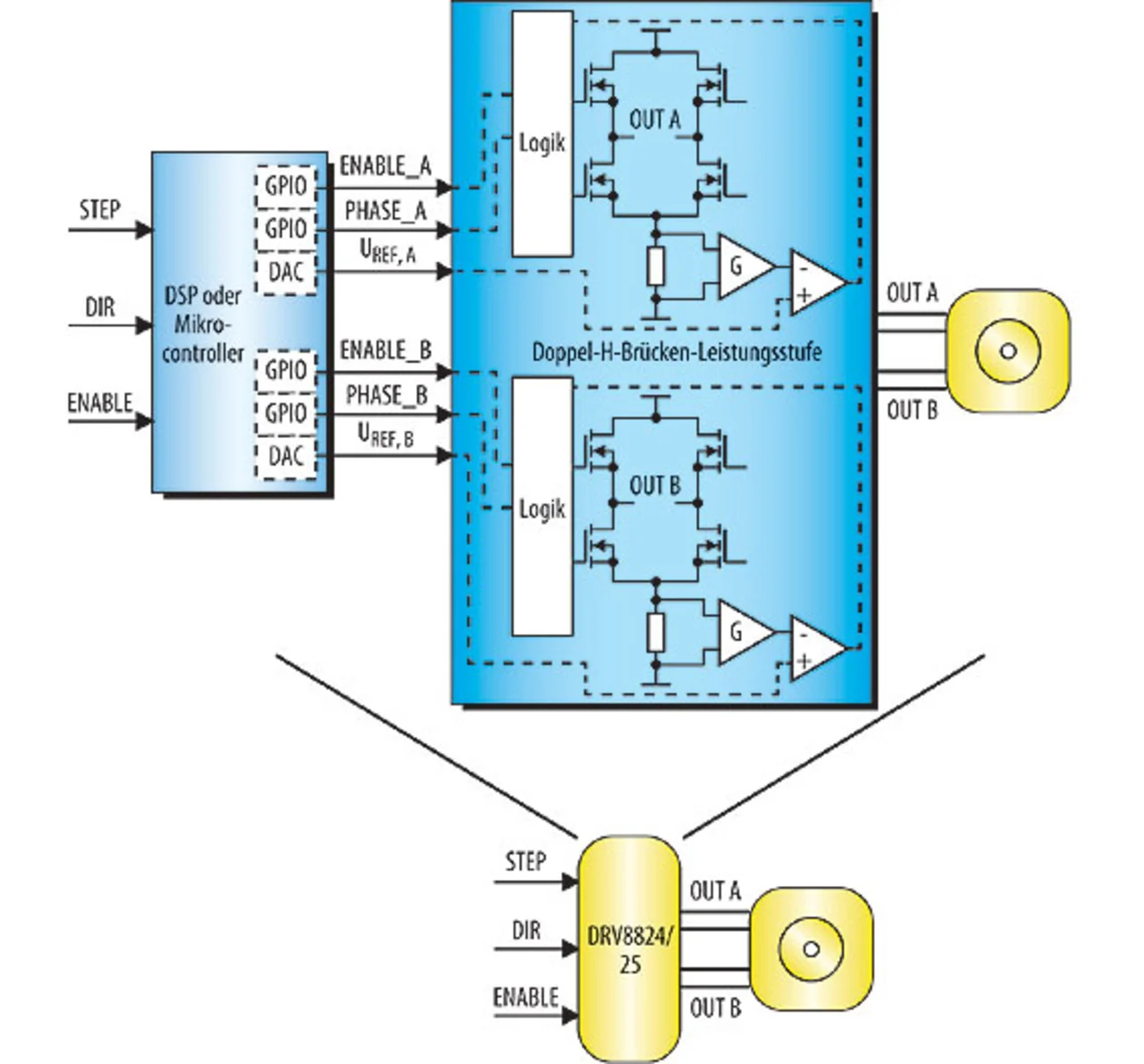 Heutige Schrittmotor-Controller wie der DRV8824 und der DRV8825 ermöglichen einen Betrieb mit bis zu 32 Mikroschritten, ohne dass eine einzige Programmzeile geschrieben werden muss. Die Logik dieser Bausteine enthält einen Indexer (Schrittschalter). Dieser erzeugt sämtliche Wellenformen, die zur korrekten Kommutierung des Schrittmotors in beiden Drehrichtungen erforderlich ist. Ein einfaches Rechtecksignal am STEP-Eingang fordert die einzelnen Schritte an, während am DIR-Eingang die gewünschte Drehrichtung signalisiert wird. Bild 2 illustriert, wie die Implementierung hier in einer Single-Chip-Lösung zusammengefasst wurde.