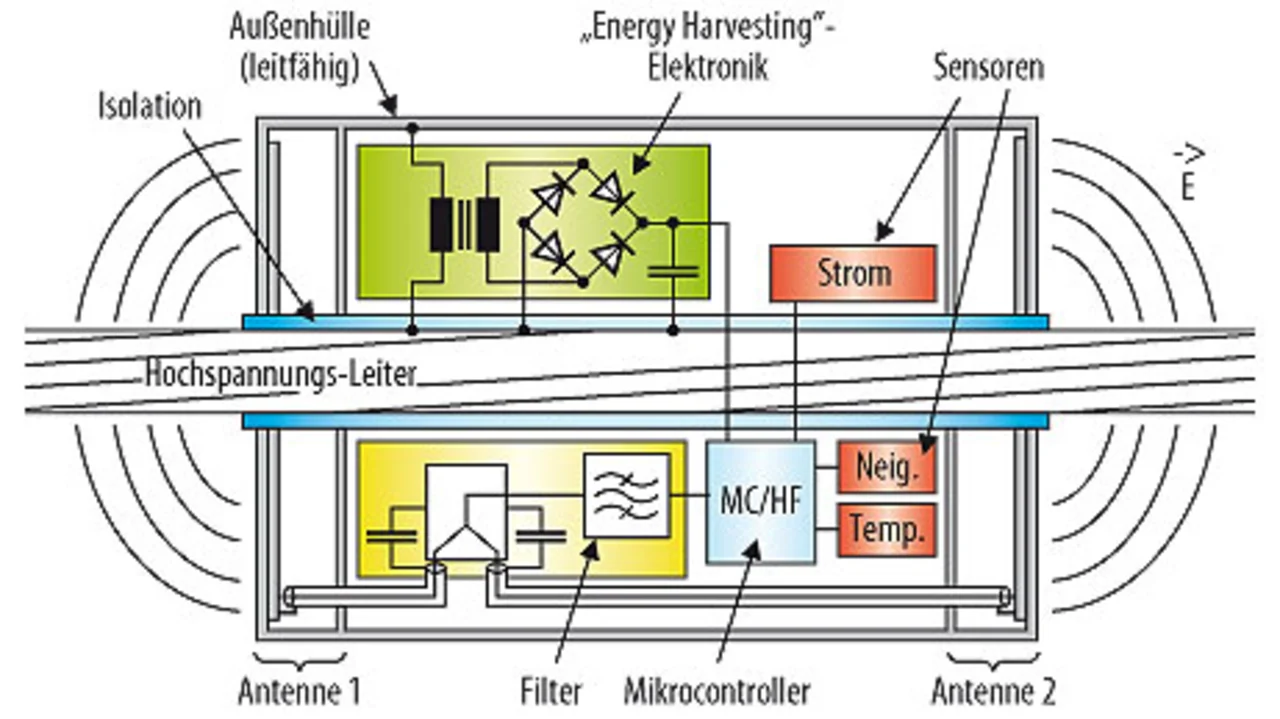 Die Belastbarkeit ist dann nicht mehr ein fester Wert, sondern hängt von der Umgebungstemperatur ab. Zum Beispiel die Leiterseile von Hochspannungsleitungen: Ihre maximal zulässige Temperatur ist meist 80 °C. Bei Schnee, Regen oder Sturm ist die Kühlung besser als bei Sonne und Flaute, entsprechend variiert die Strombelastbarkeit. Ein Sensorsystem, das Seiltemperatur und -durchhang registriert und mittels Energy Harvesting aus dem umgebenden elektrischen Wechselfeld gespeist wird, existiert schon; es ist im Elektronik-Sonderheft ecodesign im August 2011 vorgestellt worden (Bild 3) [1]. Zur Messung der Temperatur tief im Inneren von Hochspannungstransformatoren bieten sich Glasfasersensoren an. Diese haben mittlerweile einen hohen Entwicklungsstand erreicht [2]. Sehr vielseitig einsetzbar sind vor allem Faser-Bragg-Gitter (FBG): Sie erlauben eine große Zahl von Sensorpunkten in einer einzigen Glasfaser, so dass sich die Verkabelung vereinfacht.