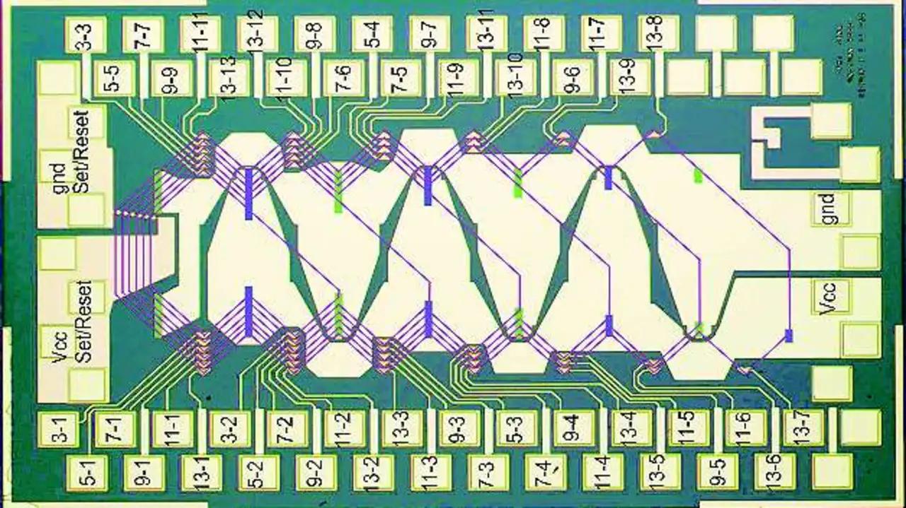 Bild 3 zeigt ein Layout eines GMR-Chips mit der Fläche 1,4 mm x 2,2 mm; dieser besteht aus sechs Schleifen mit 3,5,7,9,11 und 13 Spitzen. Mit den fünf teilerfremden Schleifen (5,7,9,11,13) können N = 5 x 7 x 9 x 11 x 13 = 45 045 Umdrehungen erfasst werden.
