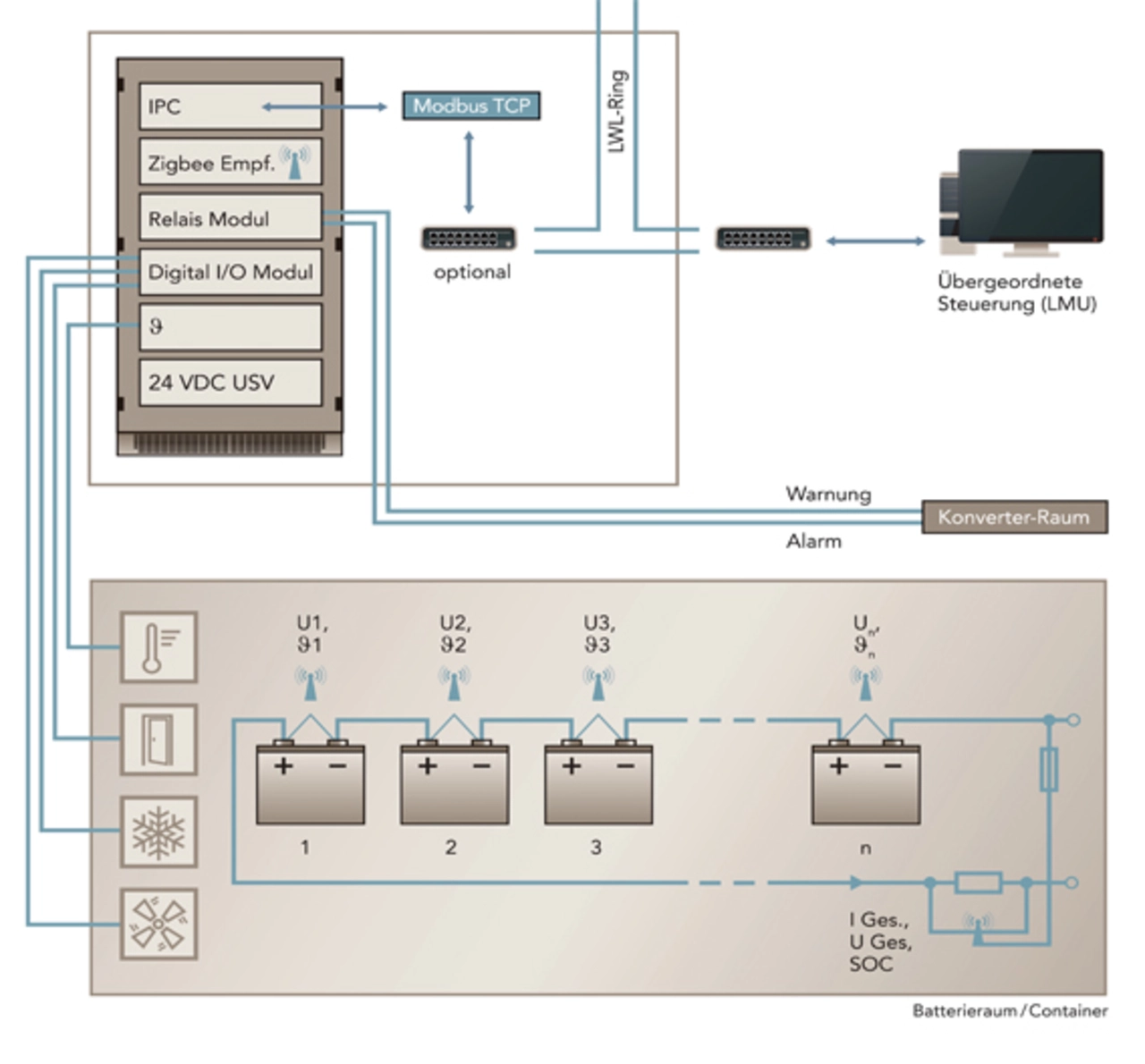 Das Empfängermodul mit dem Linux-basierten Industrie-PC, der über Modbus/TCP kommuniziert, wertet die Daten aus und visualisiert diese für nachgeschaltete Management-Systeme. Dadurch ist sogar ein proaktives Dienstleistungskonzept denkbar, denn der Batteriestatus (State of Health, SoH) lässt sich auch an einen externen Wartungsbetrieb übermitteln. Alle Module auf der Hutschiene werden mit 24 V versorgt. Diese Stromversorgung ist in einer Ausführung mit AC-Eingang (230 V) oder für direkte 24-V-Versorgung erhältlich, mit und ohne eigene USV.