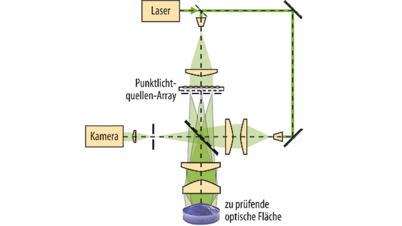 Den prinzipiellen Aufbau zeigt Bild 4: Der Strahl eines He-Ne-Lasers wird in einen Referenzstrahl und den Messstrahl gespalten. Ein diffraktives optisches Element, bestehend aus einem Mikrolinsen-Array auf der Frontseite und einem passenden Löcher-Array auf der Rückseite, wird in den Messzweig des Interferometers gesetzt. Dieses Element erzeugt eine zweidimensionale Matrix von Punktquellen, von denen die Teststrahlen des Interferometers ausgehen. Eine Linse bündelt diese Quellen und erzeugt so einen Satz von Wellenfronten mit verschiedenen Verkippungen. Nach der Reflexion an der Asphäre wird die Wellenfront durch eine weitere Linse auf den Detektor abgebildet. Eine dritte Linse fokussiert den Strahl vom anderen Zweig des Interferometers (Referenzwelle) in der Apertur und erzeugt eine plane Welle, die mit dem an der Asphäre reflektierten Messstrahl interferiert. Die Interferometer-Apertur begrenzt die Interferenzstreifen-Dichte, so dass diese groß im Verhältnis zum Pixelraster des Bildsensors bleibt.