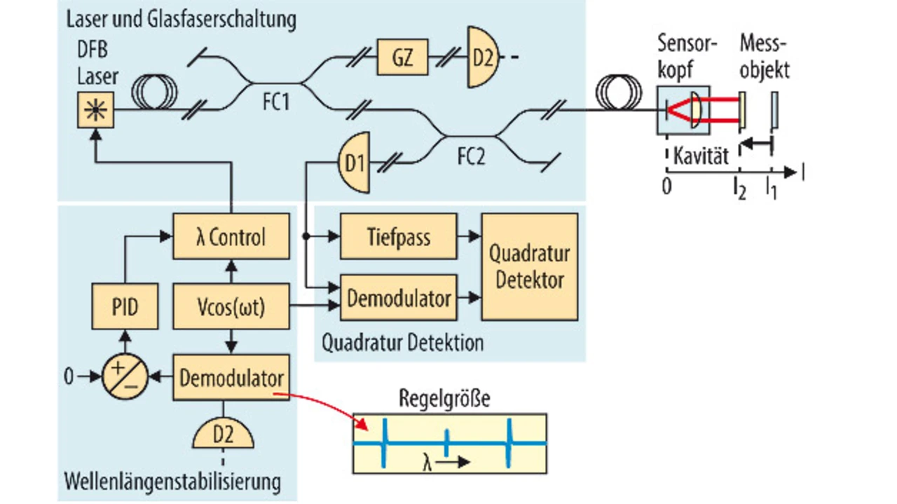 Der Nachteil dieses Instruments: Es lässt sich nicht miniaturisieren. Als geeignete Alternative fanden Zech und seine Kollegen ein Fabry-Perot-Interferometer (Bild 5). Bei diesem wirkt der Zwischenraum zwischen zwei teilreflektierenden planparallelen Platten als Resonator, dazwischen bilden sich stehende Wellen aus. Hier ist eine Miniaturisierung wesentlich leichter möglich. Zur Lichtzu- und -rückleitung dient eine Glasfaser. Bei Änderung des Abstands zwischen den Platten ändert sich auch das zurückfließende Licht periodisch in seiner Intensität. Das Quadraturprinzip mit zwei um eine Viertel-Wellenlänge versetzten Strahlen ist hier nicht ohne weiteres anwendbar. Man hat aber einen anderen Weg gefunden, um höchste Messauflösungen weit unterhalb der Wellenlänge zu erreichen. Die Strahlung der Laserdiode (DFB, einmodig, 1535 nm) erfährt über eine Strommodulation eine leichte Wellenlängenmodulation um wenige pm bei einer Frequenz von 12,5 MHz. Auf diese Weise lässt sich ebenfalls ein Quadratursignal erhalten. Der Winkel im Kreisdiagramm ist ein Maß für die Position. Beim praktisch aufgebauten System wurde bei einer Messbandbreite von 10 MHz 1 pm Auflösung erreicht. Damit lassen sich z.B. die Schwingamplituden von Piezoelementen messen. Die Messköpfe selbst sind nur wenige Millimeter groß [4].