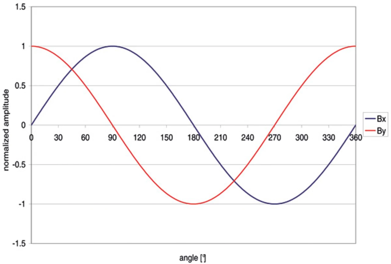 Die Sensoren der HAL-37xy-Familie eignen sich auch zur Messung von Winkelpositionen innerhalb des Vollwinkels. Der Sensor kann am Ende einer Welle oder neben einer Achse arbeiten. Eine Drehung von 360 Grad führt zu einem Sinus- und einem Kosinussignal für die »Bx und By«- oder »Bx und Bz«-Komponenten. Durch den im Sensor integrierten digitalen Signalprozessor lässt sich der Winkel nun durch die Arkustangens-Funktion ermitteln. Die Ausgangsspannung ist direkt proportional zum gemessenen Winkel. Dabei weist das 3D-HAL-Prinzip einige interessante Vorteile auf:
