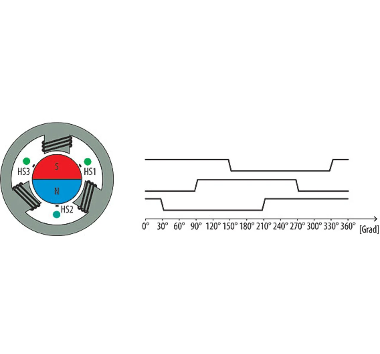 Bei der Block-Kommutierung erfolgt die Rückmeldung der Rotorlage üblicherweise durch drei im Motor eingebaute Hall-Sensoren. Der zumeist diametral ausgeführte Rotormagnet und die um 120° versetzt angeordneten Hall-Sensoren liefern damit pro Umdrehung sechs verschiedene Schaltkombinationen (Bild 1).