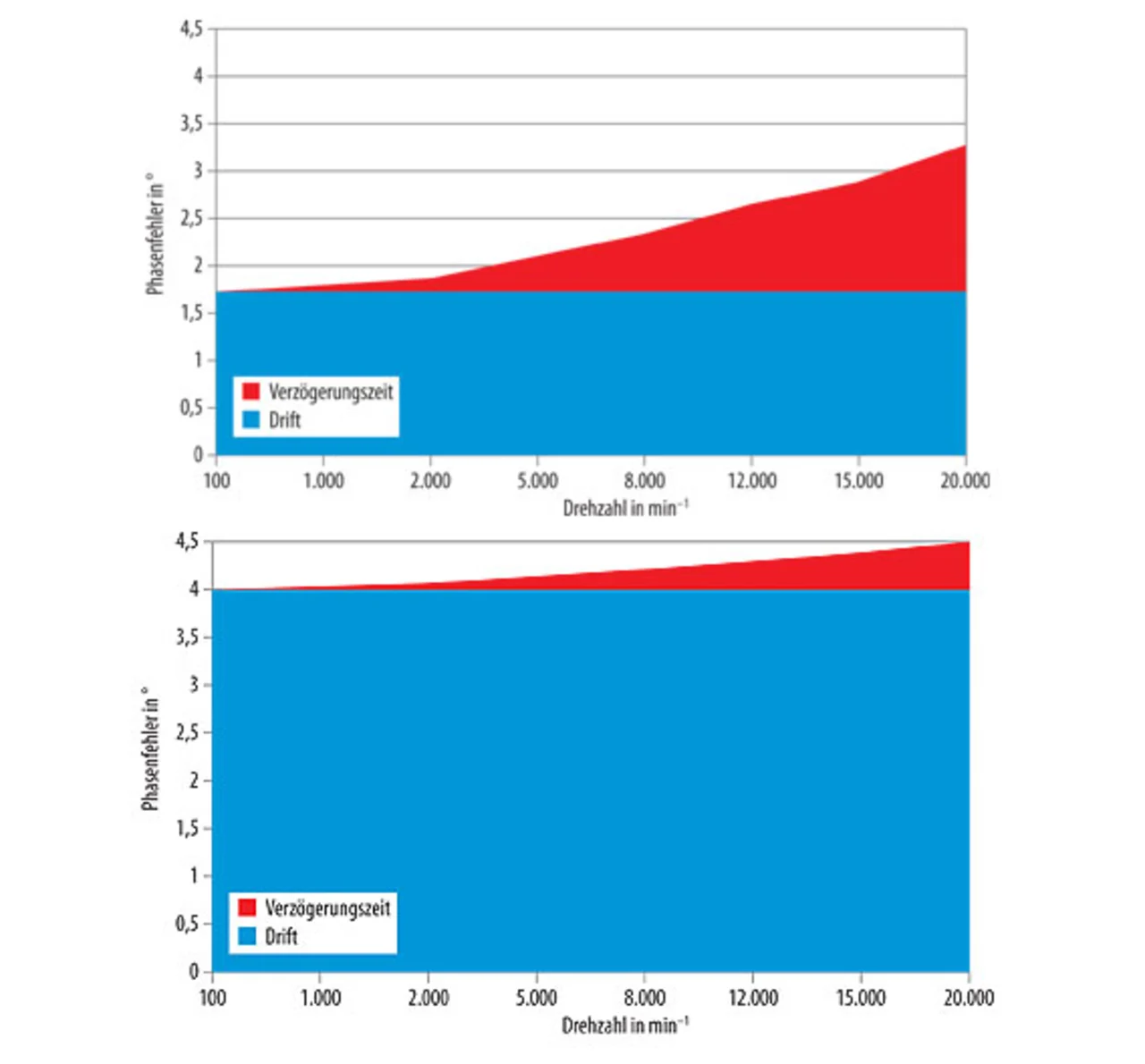 Bild 3 zeigt Berechnungen der Phasendrift als Summe aus Verzögerungszeit und Drift der Schaltschwelle für zwei Sensoren: Links TLE4961-1 (chopped), rechts die eines Wettbewerbsproduktes (unchopped). Deutlich wird hier der große Einfluss der Drift auf die Phasentreue, wobei der TLE4961-1 insgesamt einen deutlich geringeren Phasenfehler aufweist.