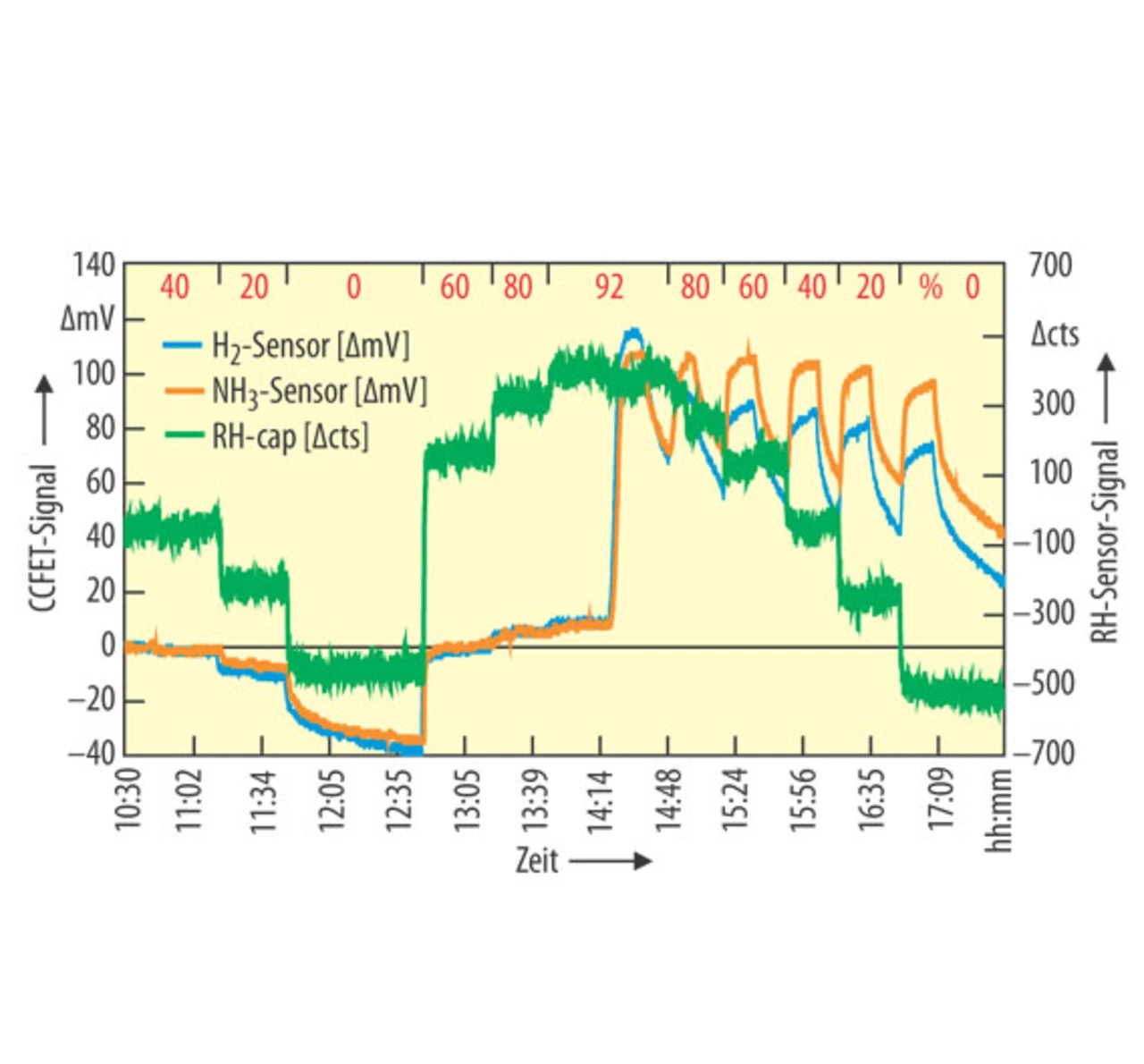 In Bild 2 sind die Signalkurven des Ammoniak- und des Wasserstoff-CCFET-Sensors sowie die des zugehörigen Feuchte-Sensors aufgetragen. Es ist bei allen Signalen die Tendenz zu erkennen, dass die Signalamplitude bei niedriger Feuchtigkeit sinkt und bei höherer ansteigt. Die Messwerte des integrierten Feuchte-Sensors sind in Grün markiert. Dieser kann, wie der ebenfalls sich auf dem Chip befindende Temperatur-Sensor, sowohl für Kompensationszwecke als auch für eigenständige Messungen verwendet werden.